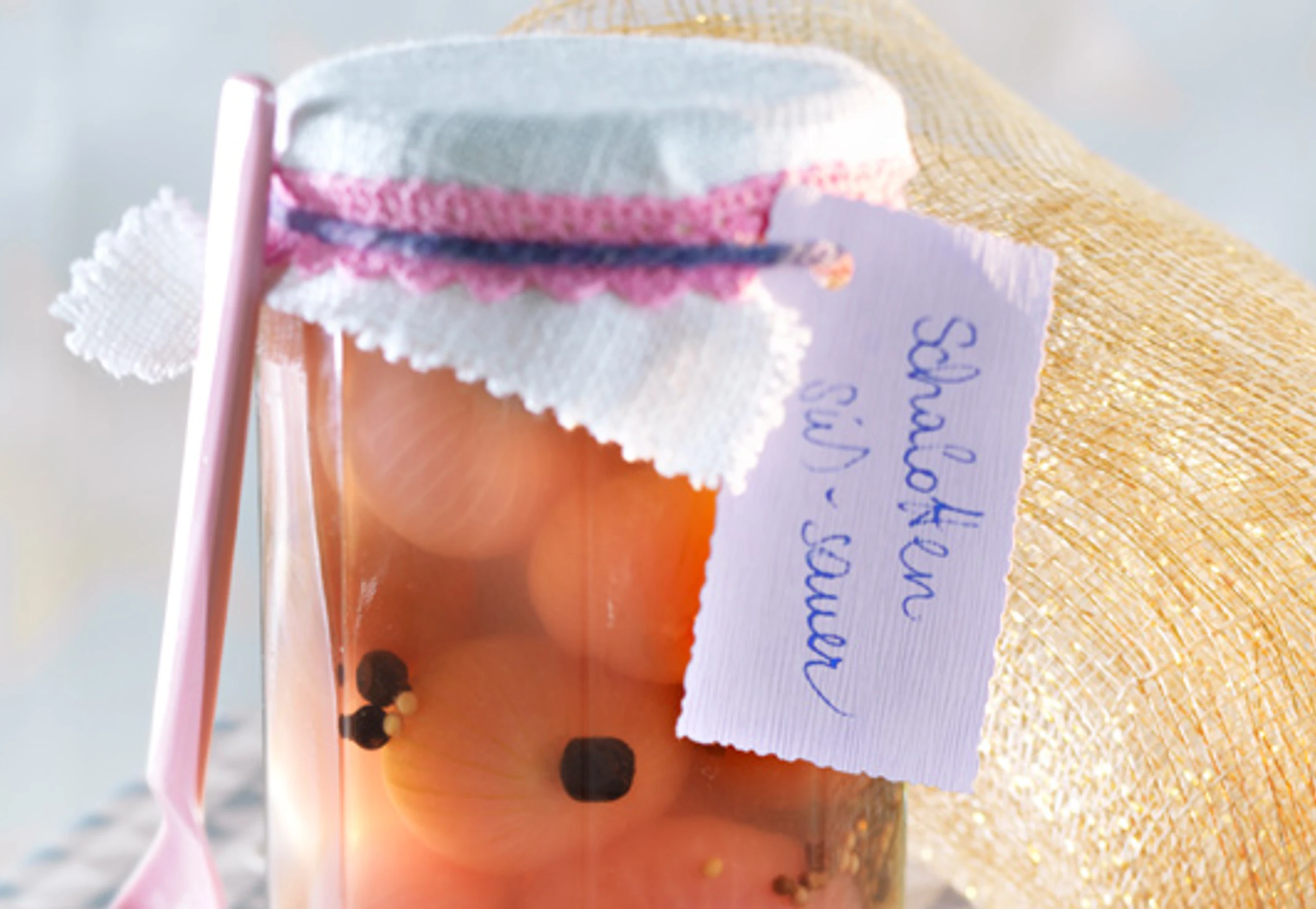 Schalotten schälen, mit Essig, Wasser, Zucker und Gewürzen weich kochen (ca. 30 Minuten).
