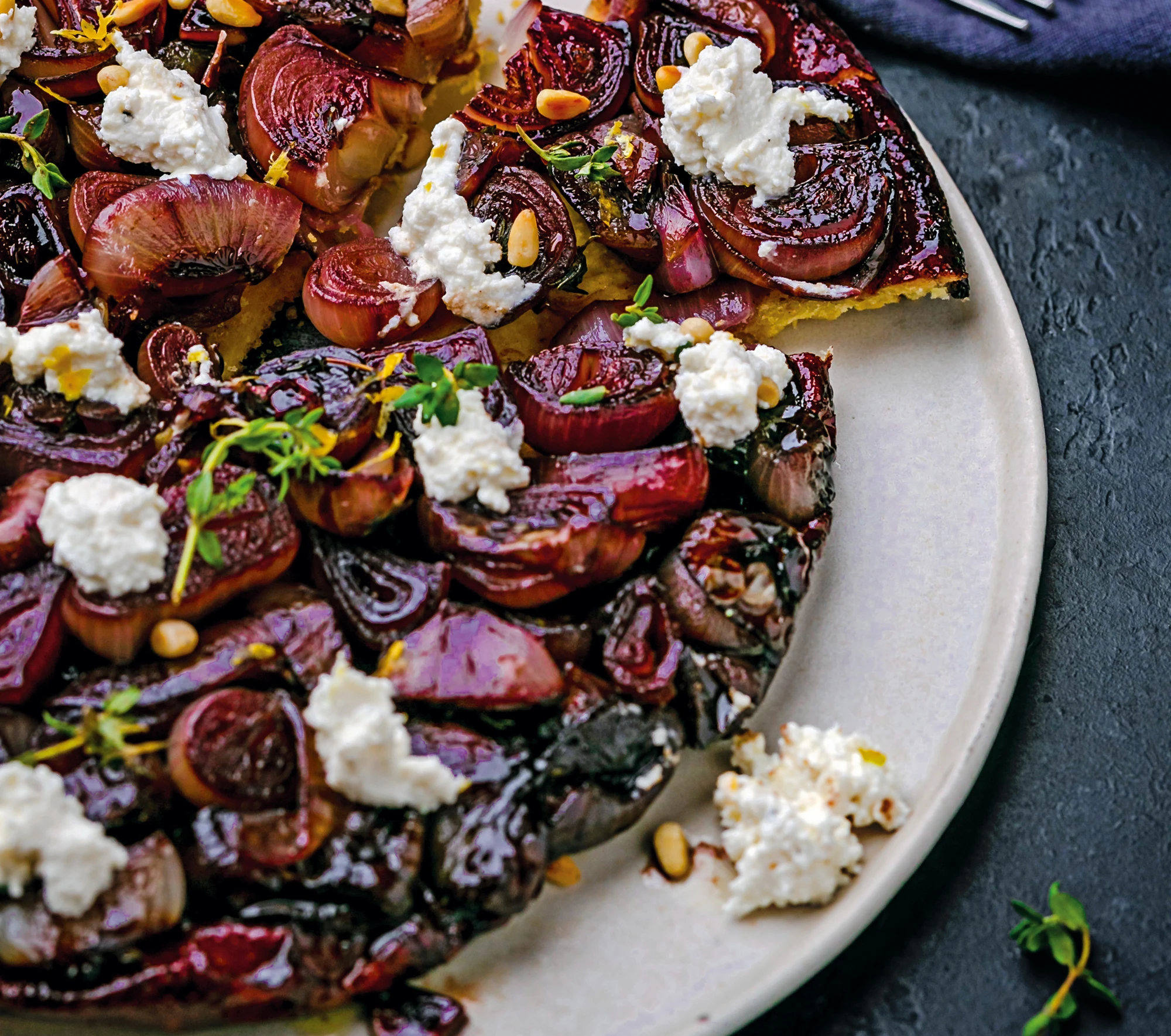 Pfanne aus dem Rohr nehmen, Tarte auf einen Servierteller stürzen, Ricotta darauf verteilen, mit Pignoli und Thymian garnieren.