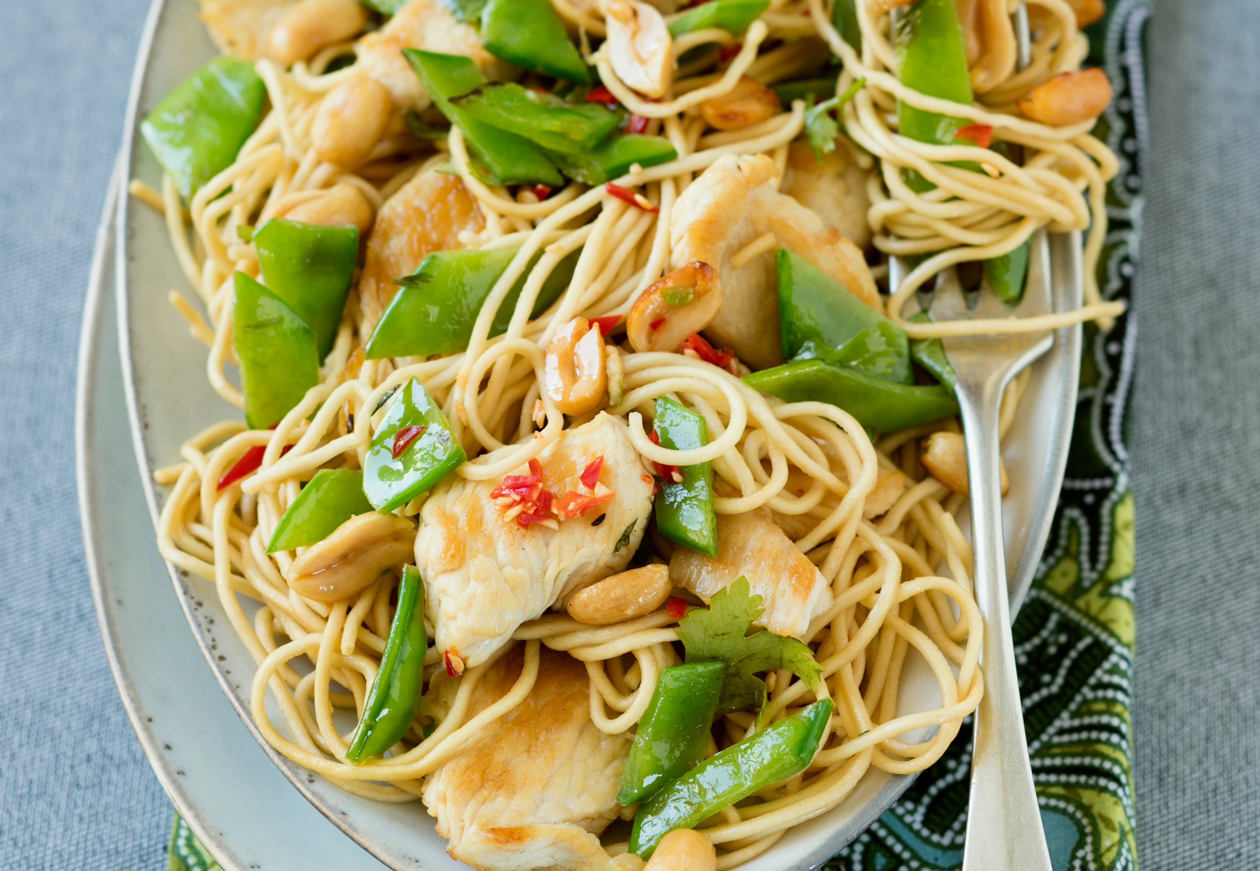 Scharfe Nudeln mit Putenstreifen und Erdnüssern
