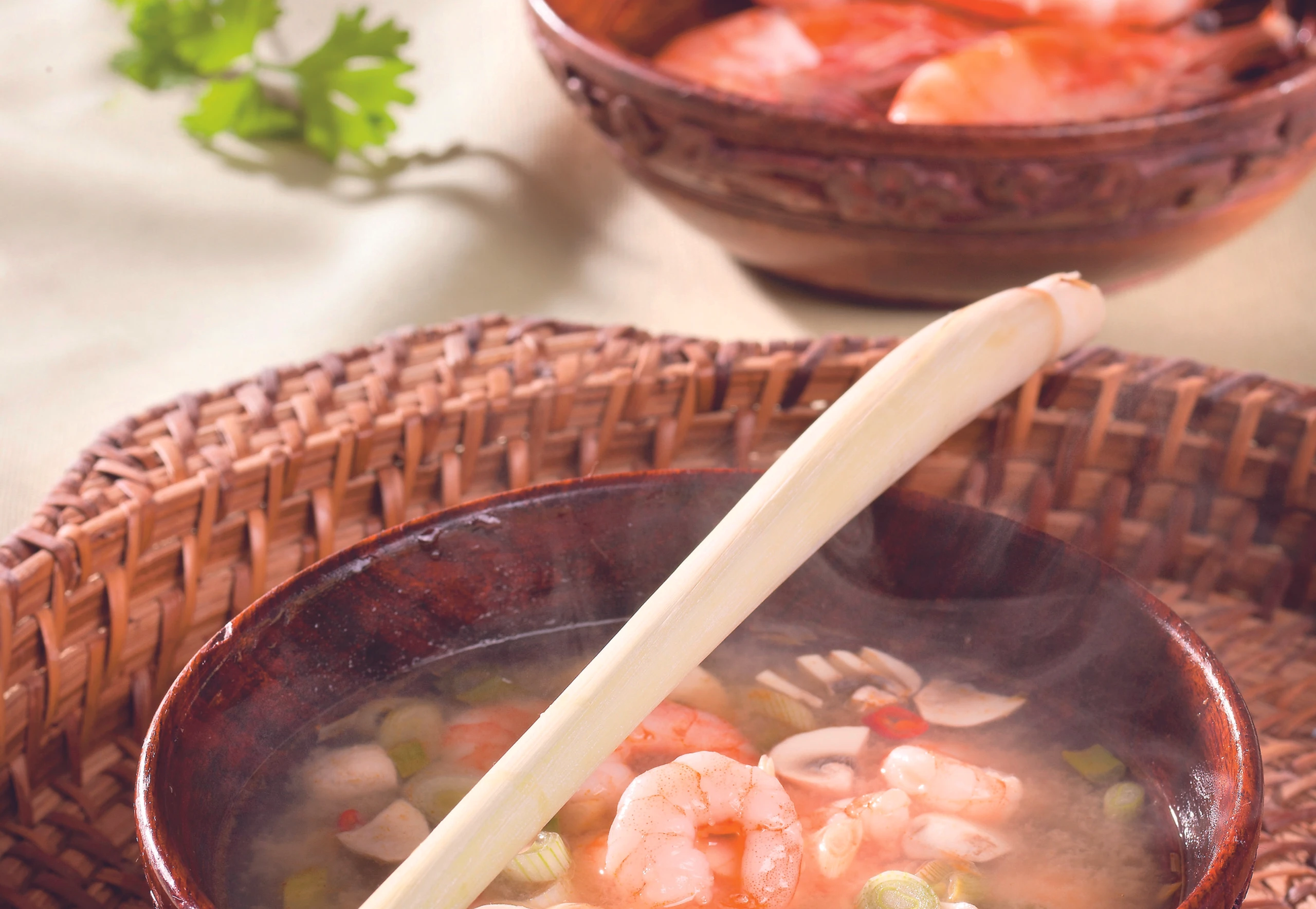 Chili, Zitronengras und Galgant fein schneiden und mit den Kaffirblättern in einen Topf geben. Gemüsesuppe zugießen und aufkochen. Fischsauce und Limettensaft zugeben. Suppe bei schwacher Hitze 10 Minuten ziehen lassen.