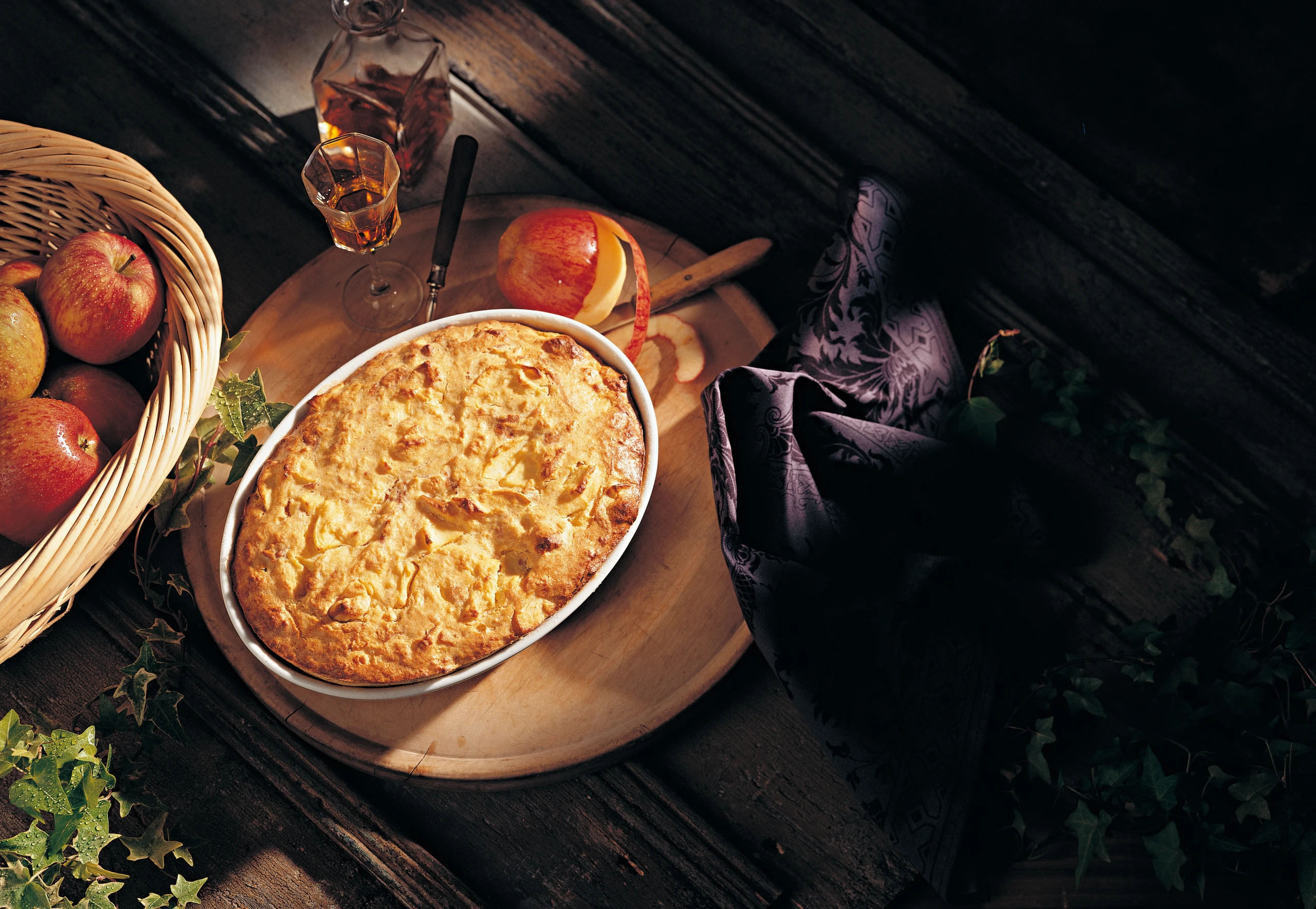 Eiklar mit der Hälfte des Kristallzuckers zu Schnee schlagen. Restlichen Zucker zugeben und Schnee fest ausschlagen. Äpfel, Rosinen und Brot mischen, Schnee behutsam unterheben.