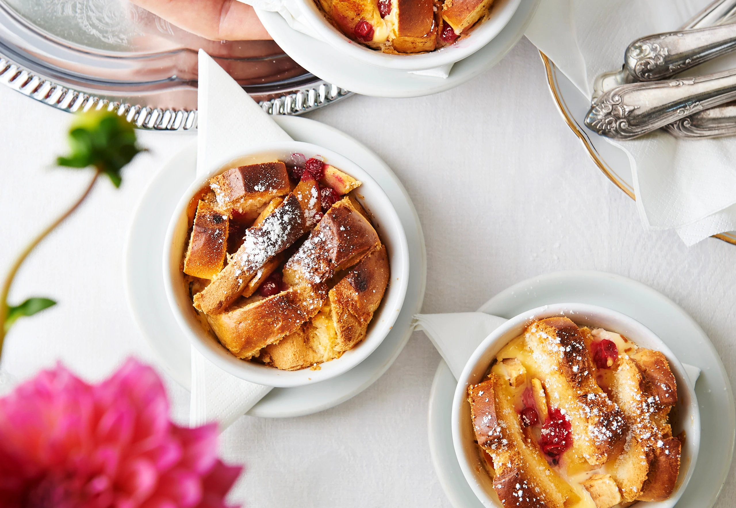 Brioche, Birnen und Cranberrys in die Förmchen schlichten und mit Royal auffüllen. Im Rohr (mittlere Schiene) ca. 30 Minuten goldbraun backen. Herausnehmen, mit Staubzucker bestreuen und noch warm servieren.