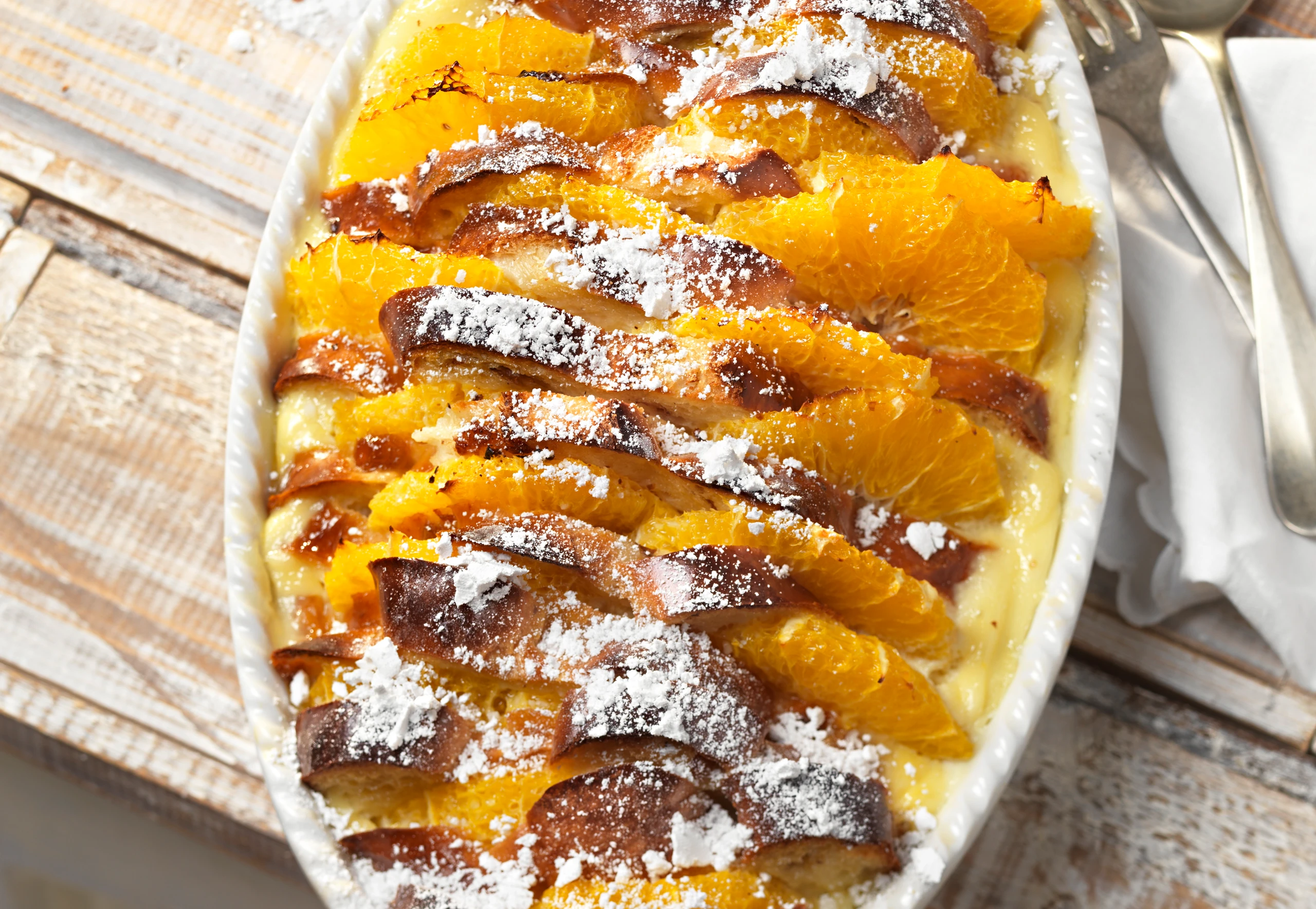 Orangen so schälen, dass auch die weiße Innenhaut entfernt wird. Brioche in 1 cm, Orangen in 0,5 cm dicke Scheiben schneiden.