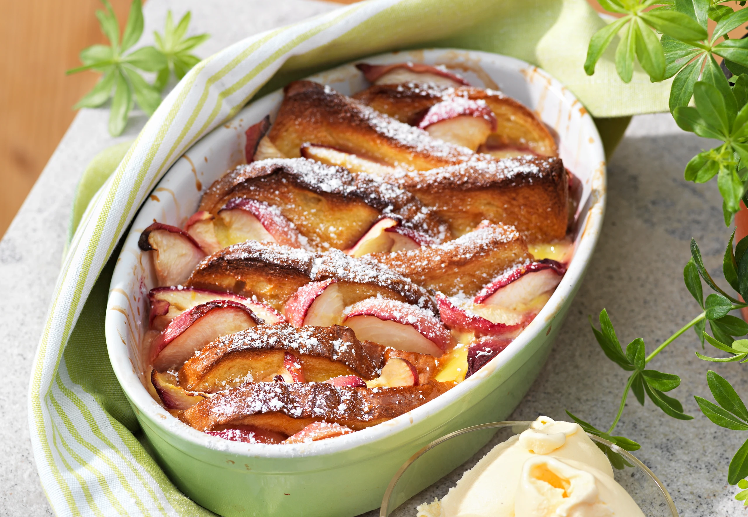 Brioche und Pfirsichspalten abwechselnd in die Form schichten, mit Royale übergießen und im Rohr (untere Schiene / Gitterrost) ca. 50 Minuten backen.