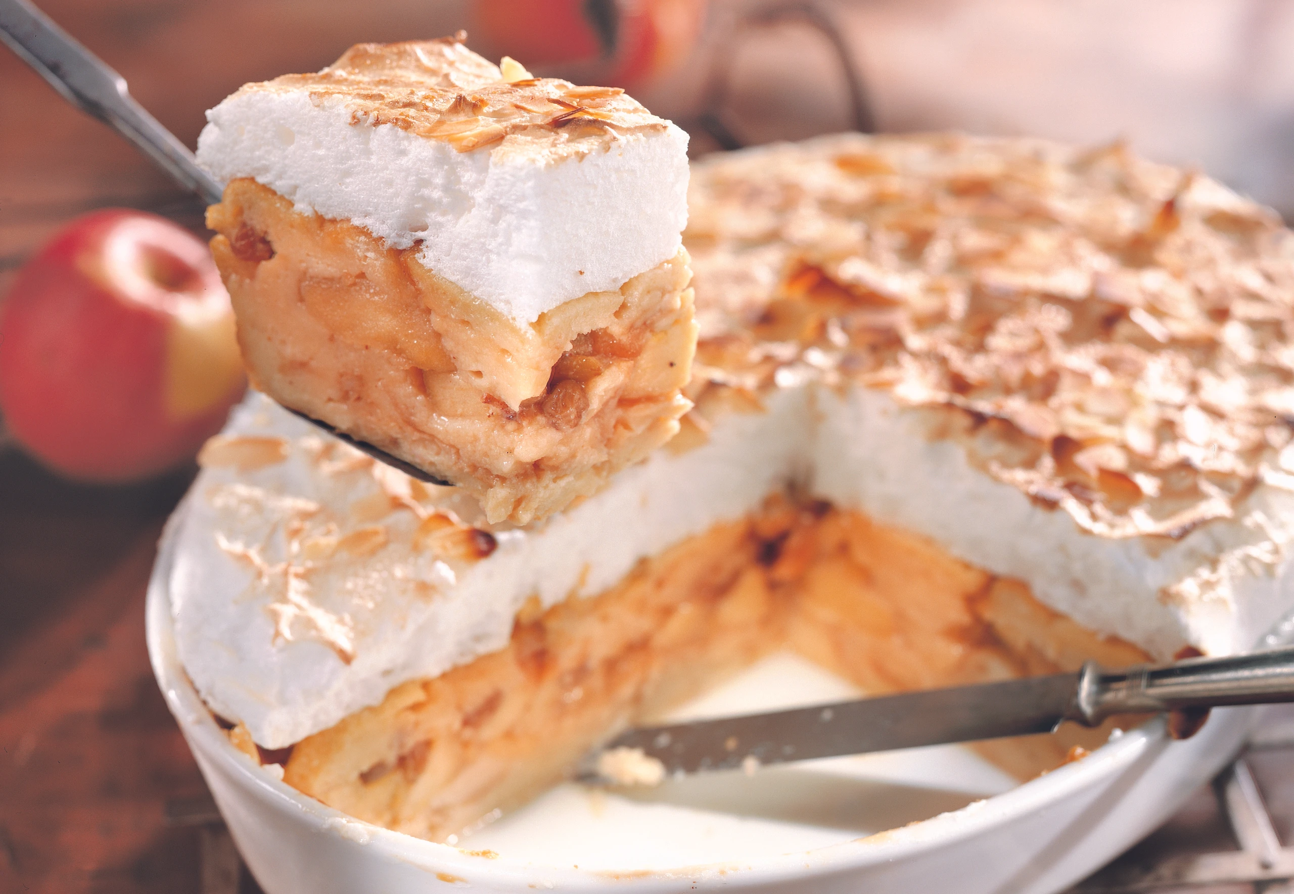 Milchbrot in ca. 1 cm dicke Scheiben schneiden, die Hälfte davon in die Form schichten und mit der Hälfte der Eiermilch übergießen. Apfelfülle darauf verteilen, restliche Brotscheiben darüberlegen, mit der übrigen Eiermilch übergießen.