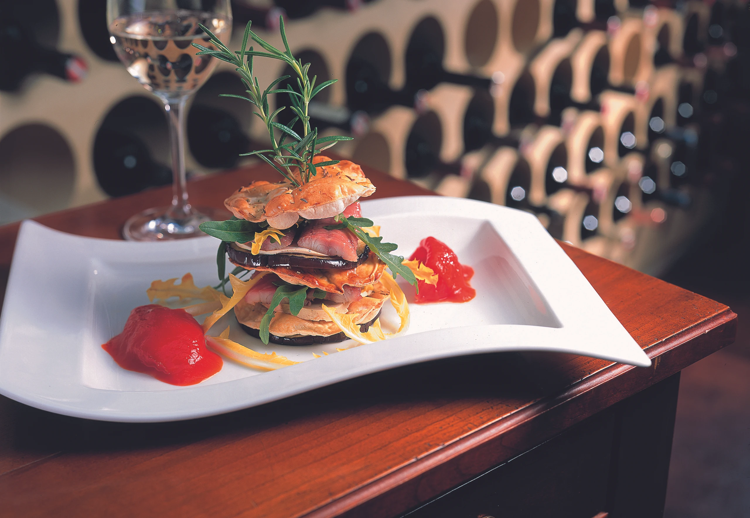 Auf jeden Teller nacheinander Melanzani, Teigscheibe, Tofu, 2 Aalstücke und Salatblätter schichten. Weiter gehts mit Teig, Melanzani, Tofu, Aal und Salat. Mit einem Strudelblatt abschließen. In jedes Türmchen durch das Loch der Teigscheiben 1–2 Rosmarinzweige stecken. Scheiterhaufen mit Paradeiskompott servieren.