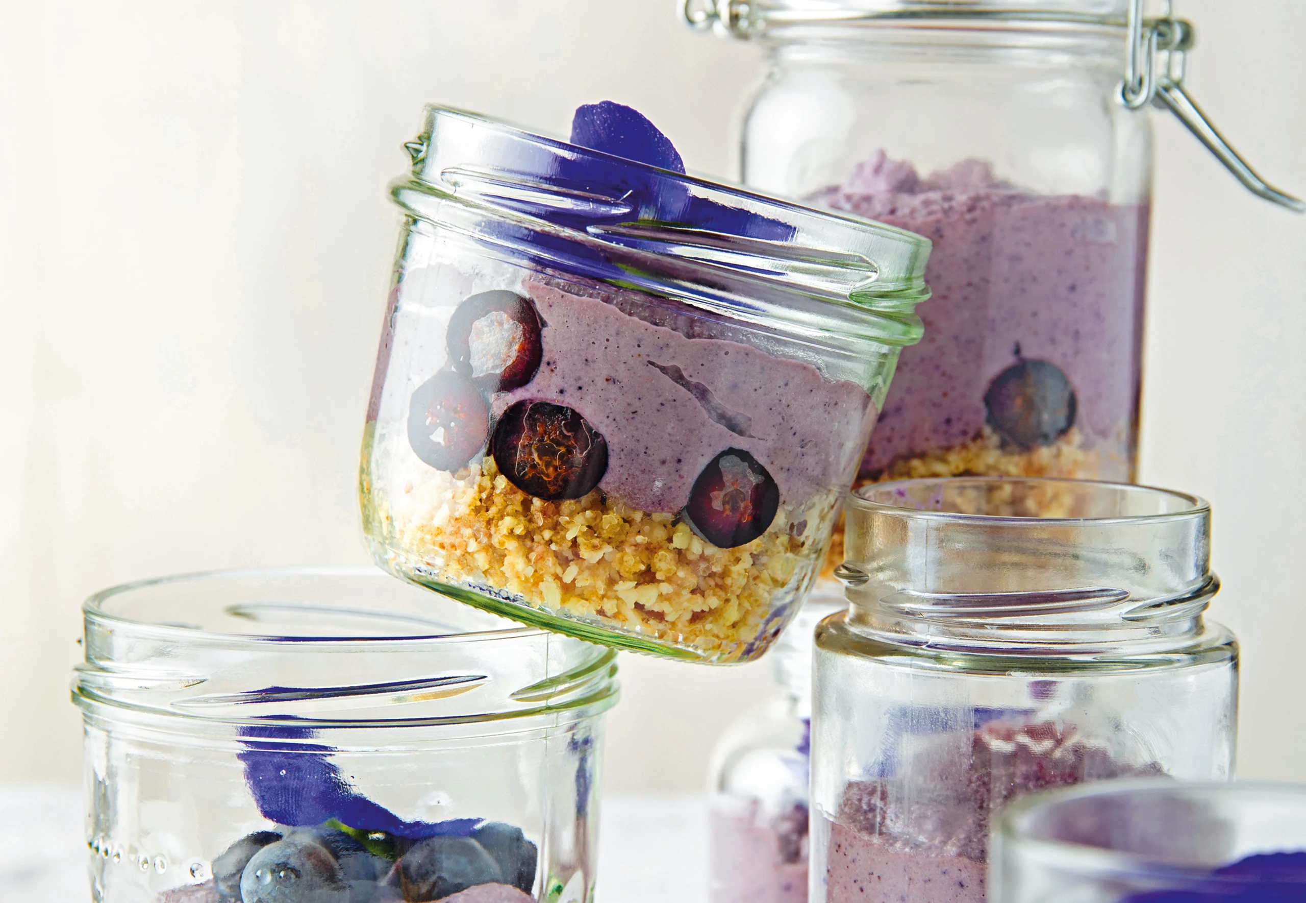 Für die Creme Kokosöl schmelzen und mit den übrigen Zutaten im Kutter zerkleinern, bis eine Creme entsteht. Eventuell mit mehr Ahornsirup nachsüßen. Creme abwechselnd mit den frischen Heidelbeeren in die Gläser füllen und mit den Blüten verzieren.