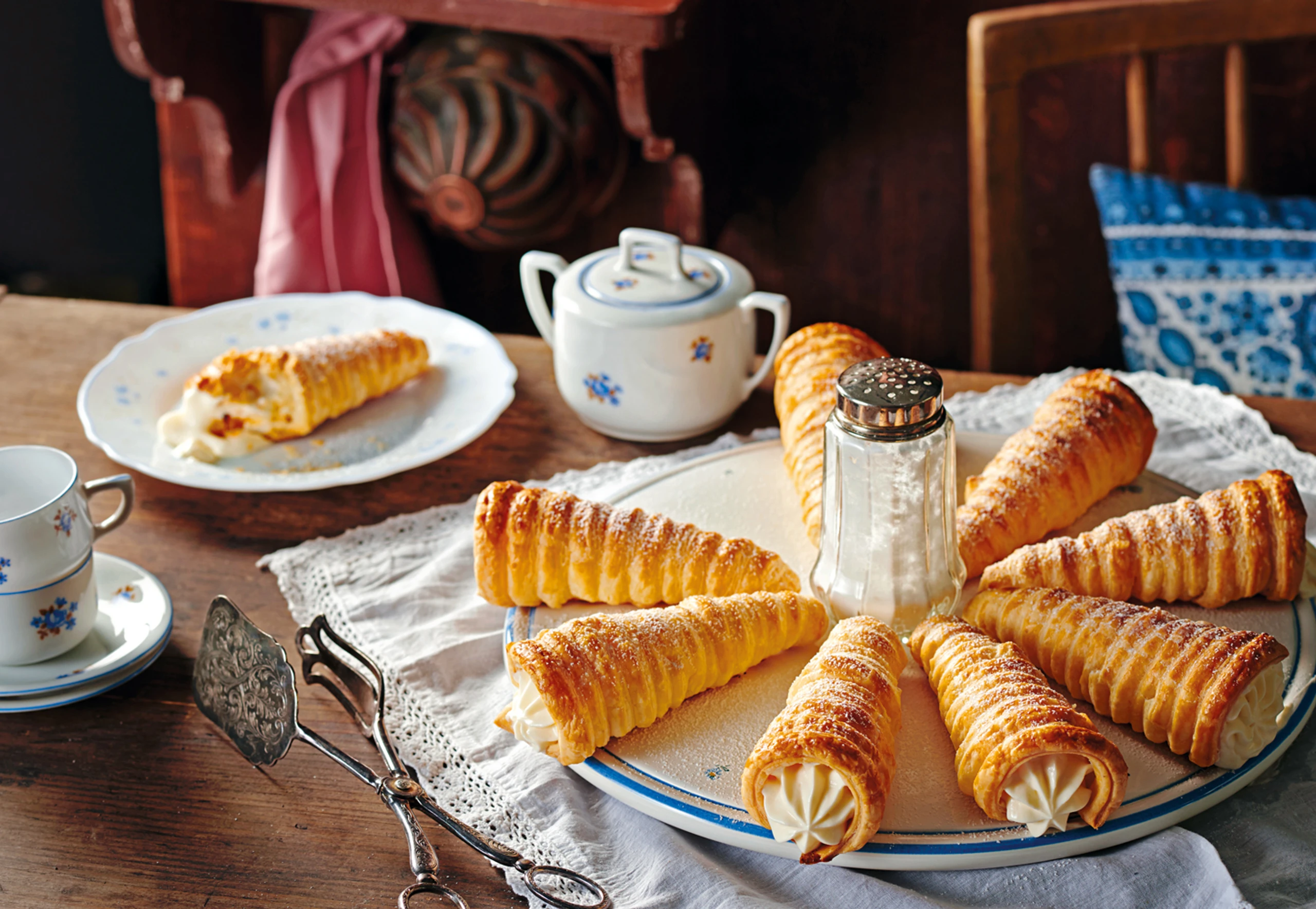 Blätterteig in 3 cm breite Streifen schneiden und überlappend um die Schillerlocken-Formen wickeln. Schillerlocken auf das Blech legen und mit Ei bestreichen. Im Rohr (mittlere Schiene) ca. 20 Minuten goldbraun backen.