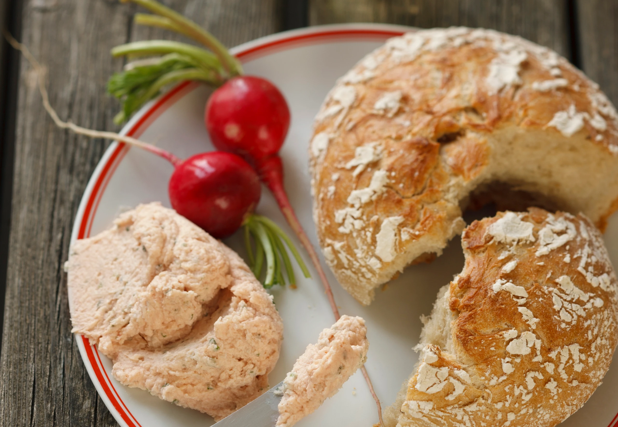 Topfen, Schinkenpüree, Butter, Petersilie und Kren verrühren. Aufstrich mit Salz, Pfeffer, Majoran und Senf würzen.