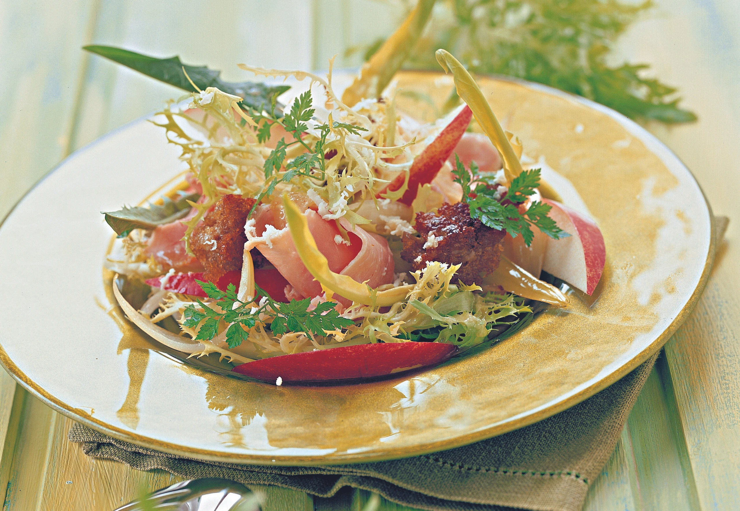 Frisée und Löwenzahnsalat waschen, trockenschleudern und mit den restlichen Salatzutaten anrichten. Dressing darüber verteilen.