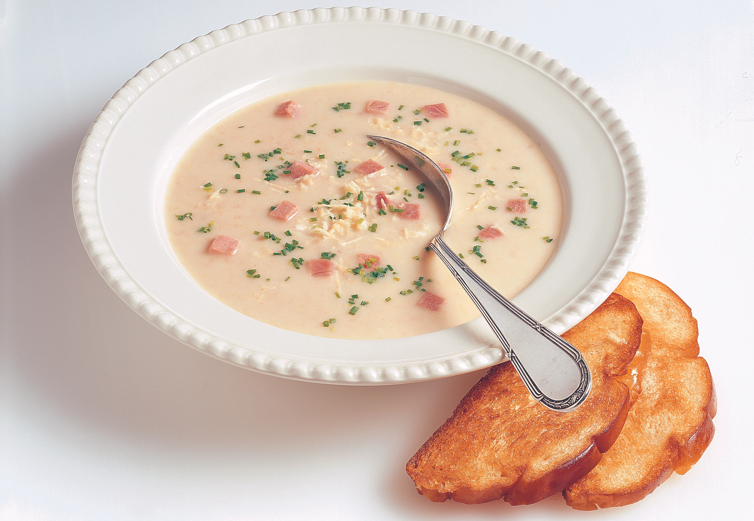 Schinken in kleine Würfel schneiden, ca. ein Drittel davon für die Einlage reservieren. Zwiebel schälen, klein würfelig schneiden, mit dem übrigen Schinken in Butter hell anschwitzen.