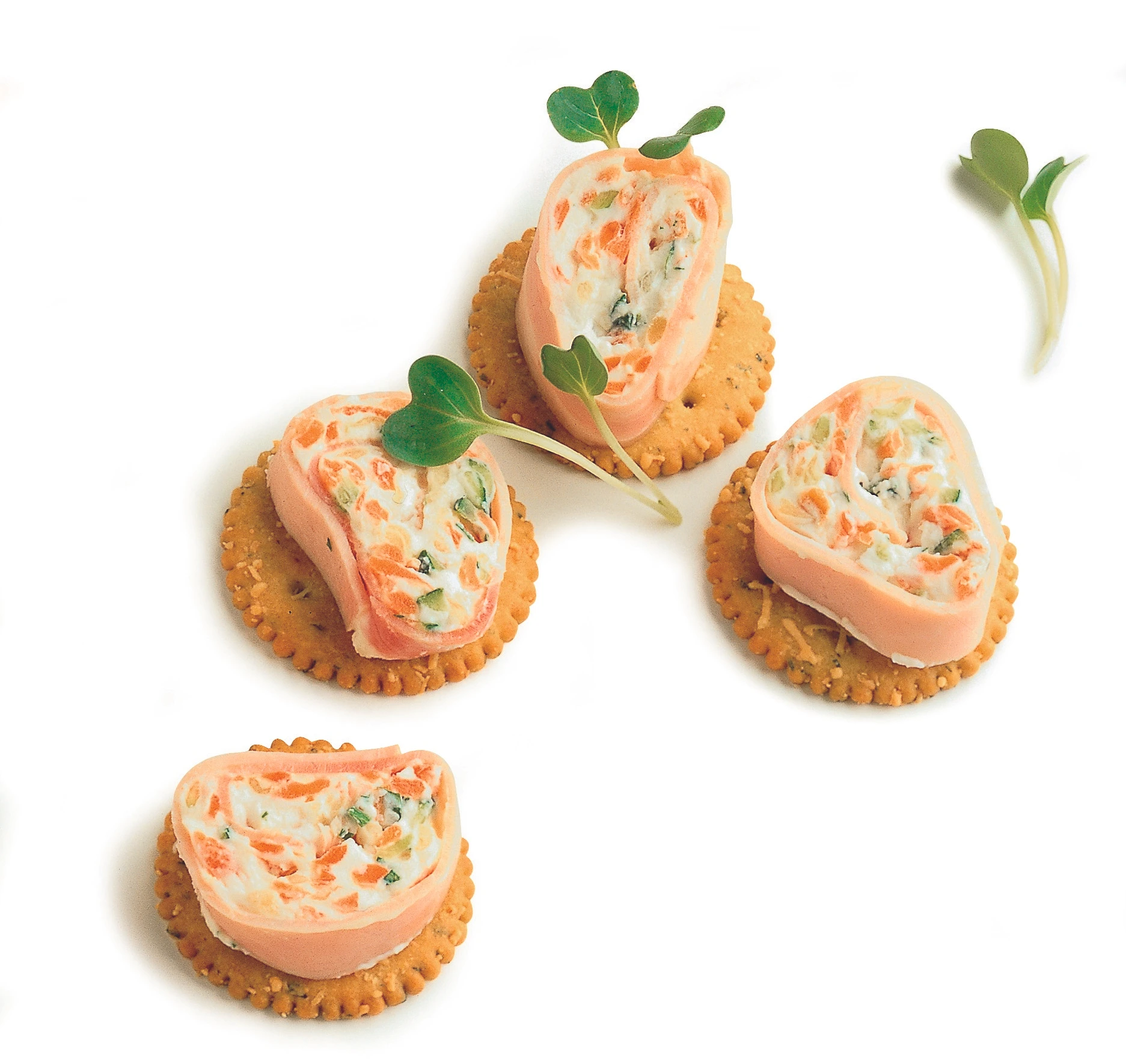 - Schinkenblätter auflegen, mit der Fülle bestreichen und eng einrollen. Schinkenrollen mit Frischhaltefolie zugedeckt ca. 1 Stunde kühlen.
