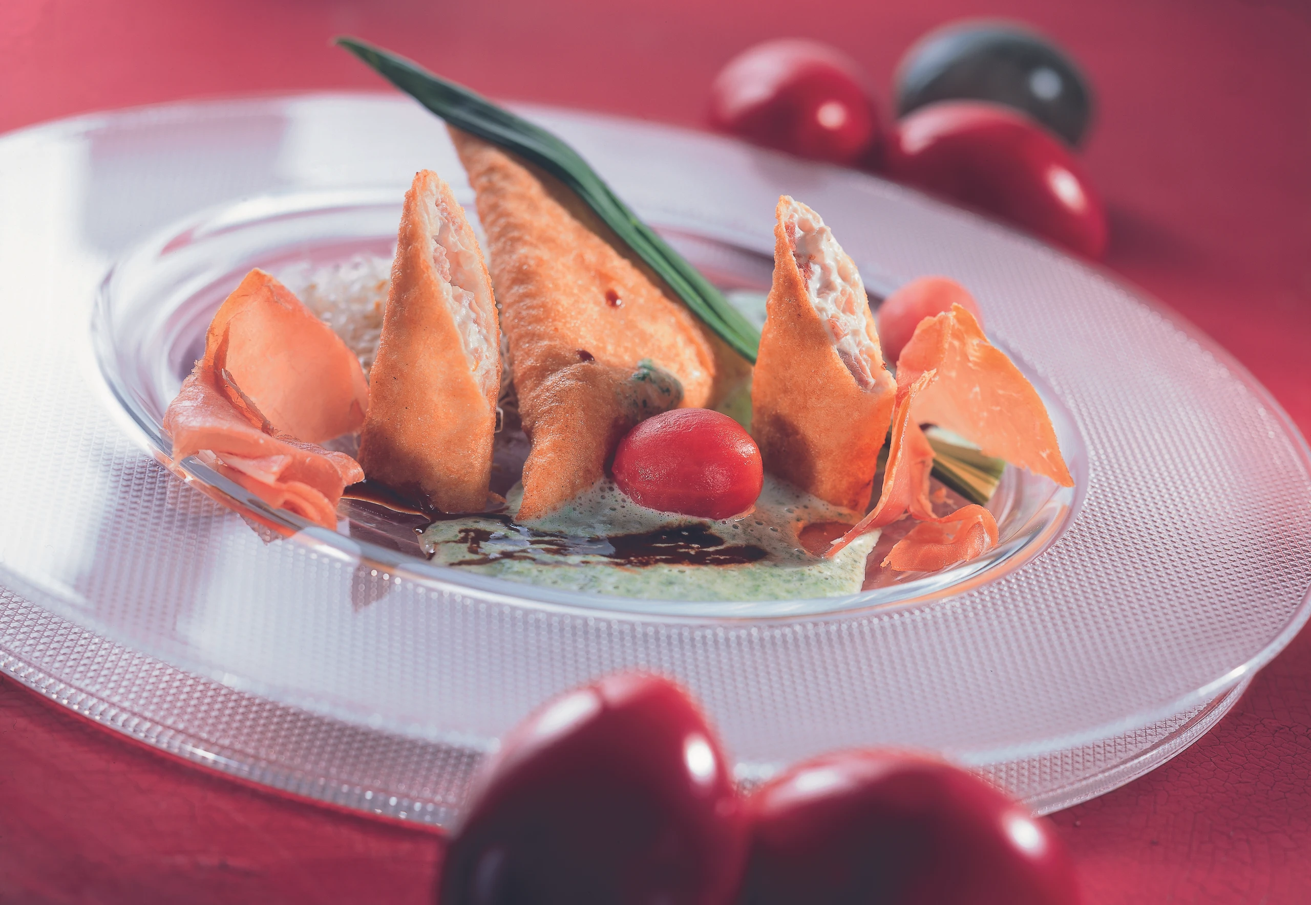- Sprossen wenig salzen, mit Sesamöl vermischen und mit den Kirschparadeisern auf Tellern anrichten. Tascherln, schräg halbierte Röllchen und Schinkenblätter darauf setzen und mit dem Schaum servieren.