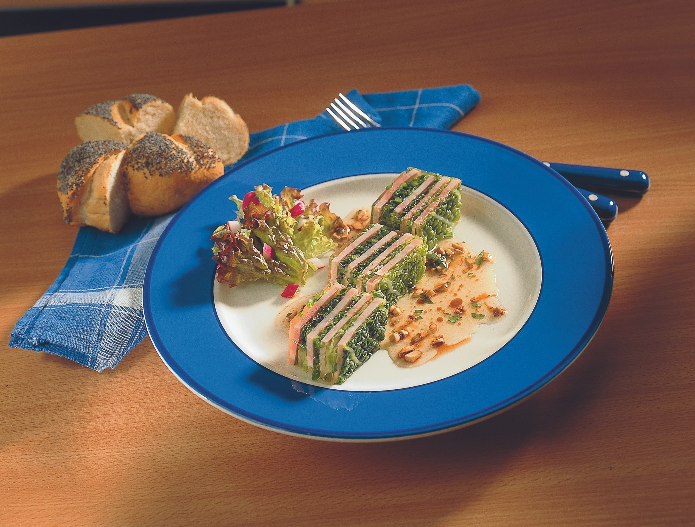Abwechselnd Kohl- und Schinkenblätter in die Form schichten, jede Lage mit Suppe übergießen. Form mit der restlichen Suppe bis zum Rand auffüllen. Als letzte Lage Kohlblätter darauf legen.