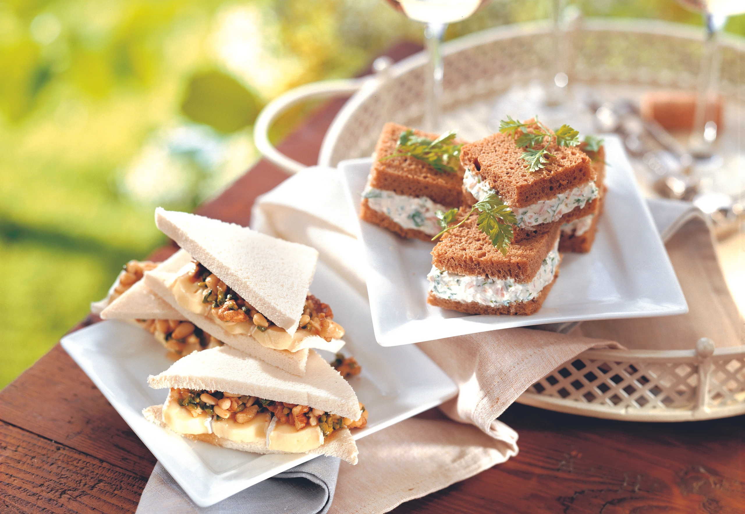 Brote entrinden. Die Hälfte der Brote mit Creme bestreichen, übrige Scheiben darauf legen und andrücken. Brote in Stücke schneiden und mit Kerbel garnieren.