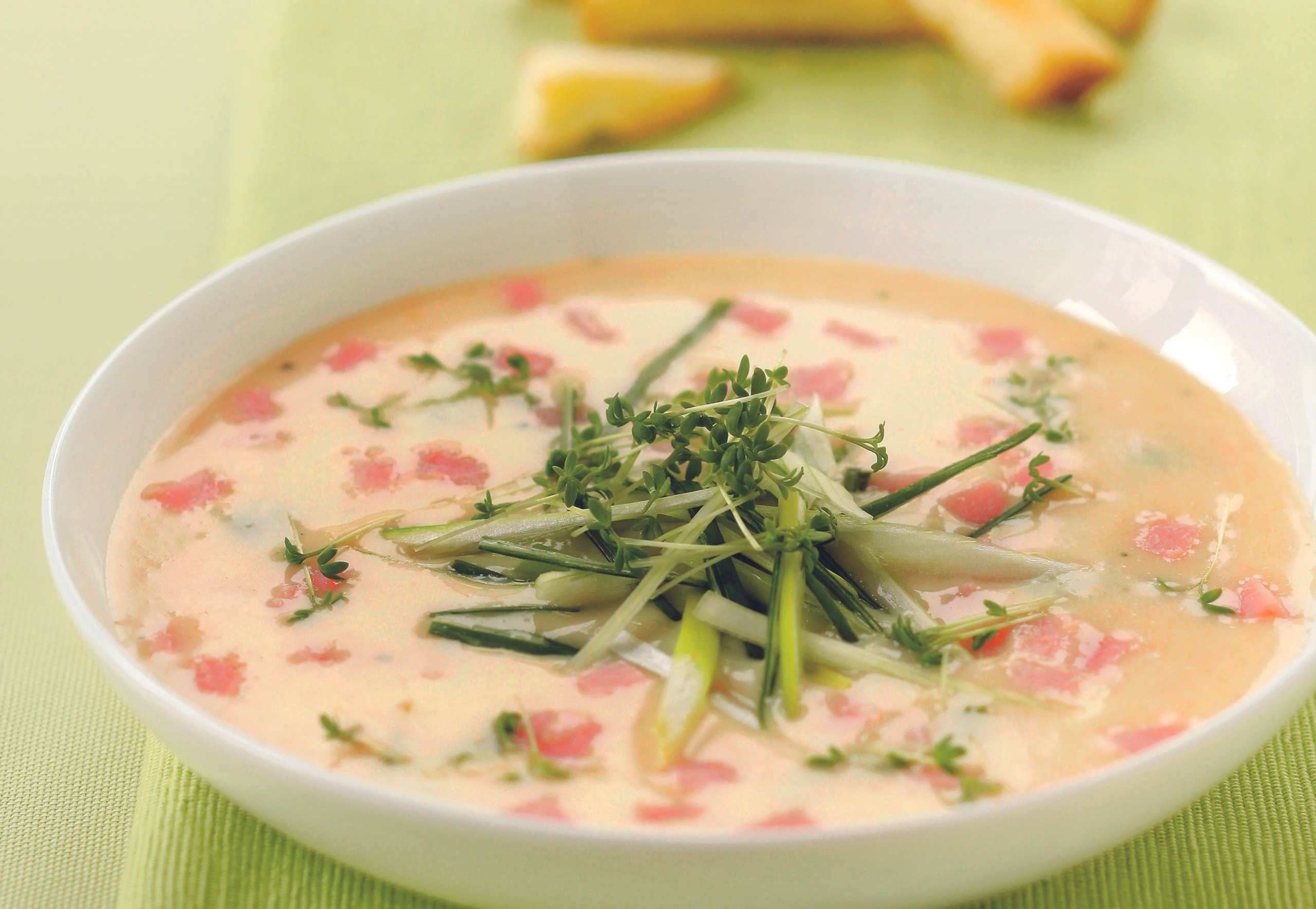 - Kresseblättchen von den Stielen schneiden. Gegen Ende der Garzeit reservierten Schinken in die Suppe rühren. Suppe mit Salz, Pfeffer und Muskat würzen. Suppe mit Zwiebelstreifen und Kresse garniert servieren. Dazu passt Brioche.
