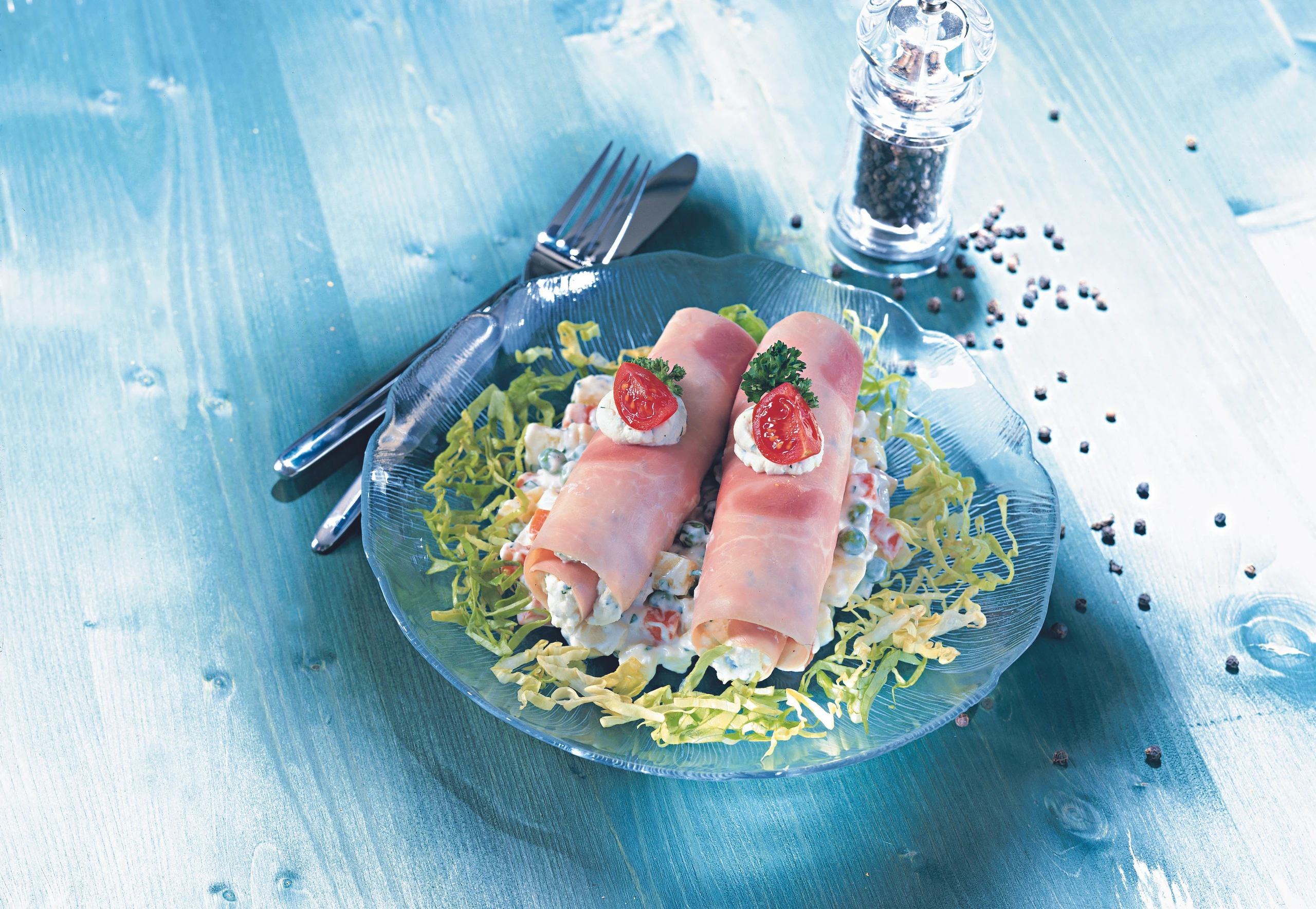 - Schinkenrollen auf Gemüsemayonnaise anrichten und mit den Salatstreifen, der restlichen Fülle, Paradeisvierteln und Petersilie garnieren.