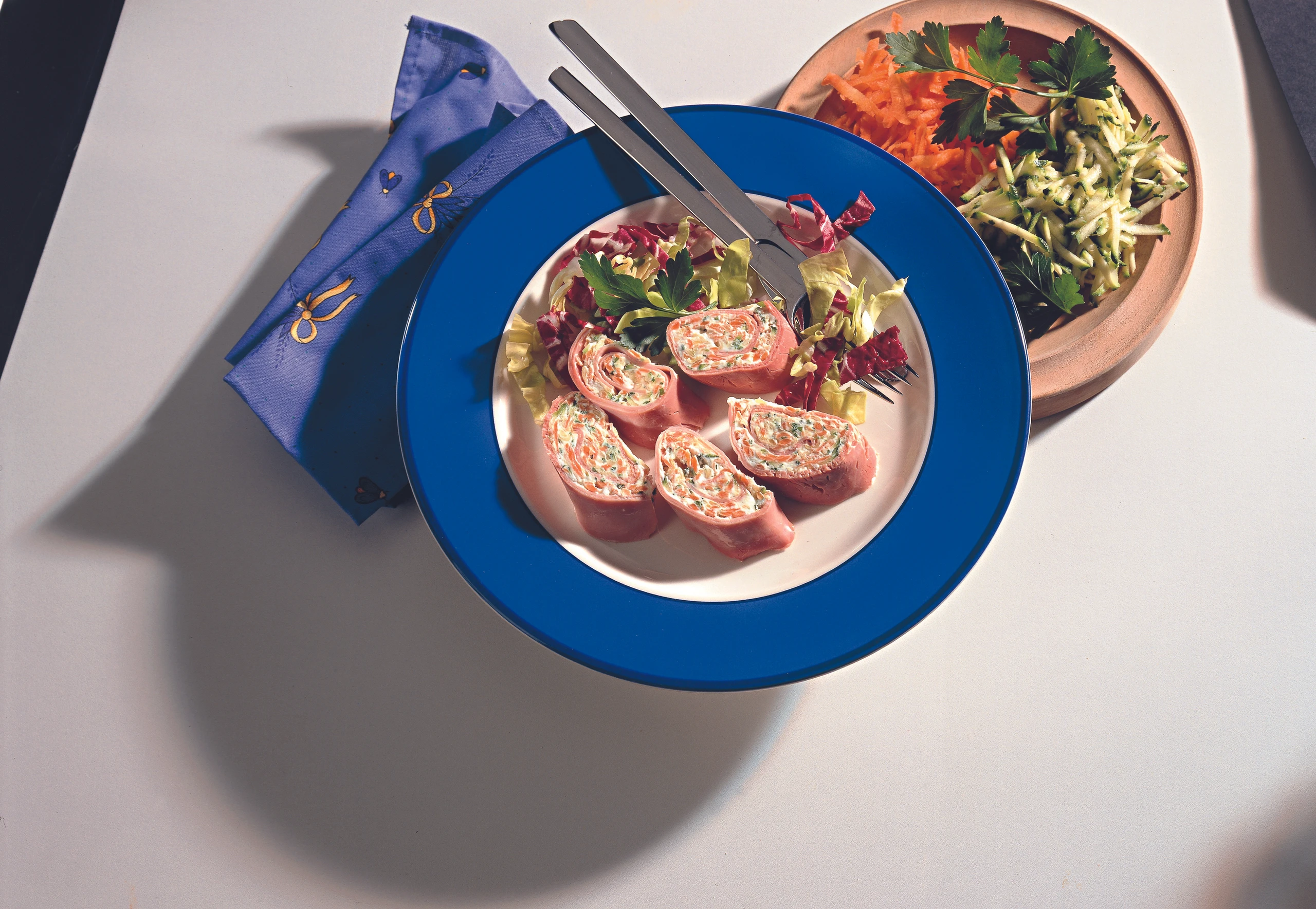 Schinkenrollen mit Rohkost-Kräuter-Fülle und Streifensalat