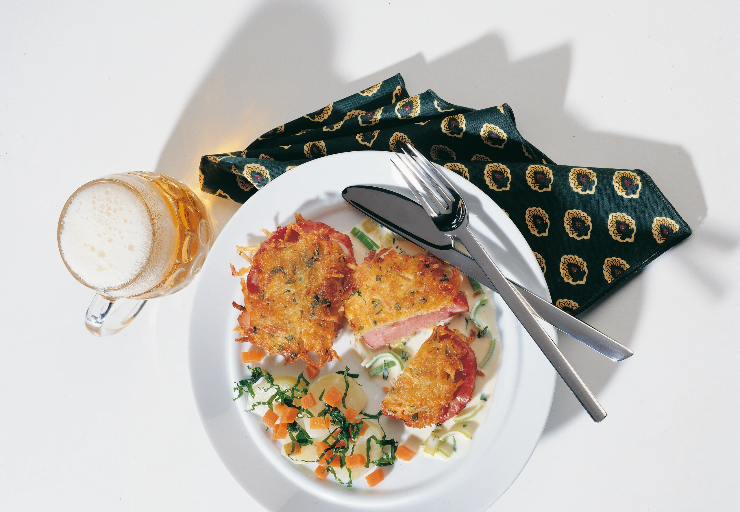 Erdäpfel waschen, schälen, grob raspeln und in einem Küchentuch gut ausdrücken. Raspel mit dem Dotter vermischen und mit Salz, Pfeffer und Kümmel würzen.