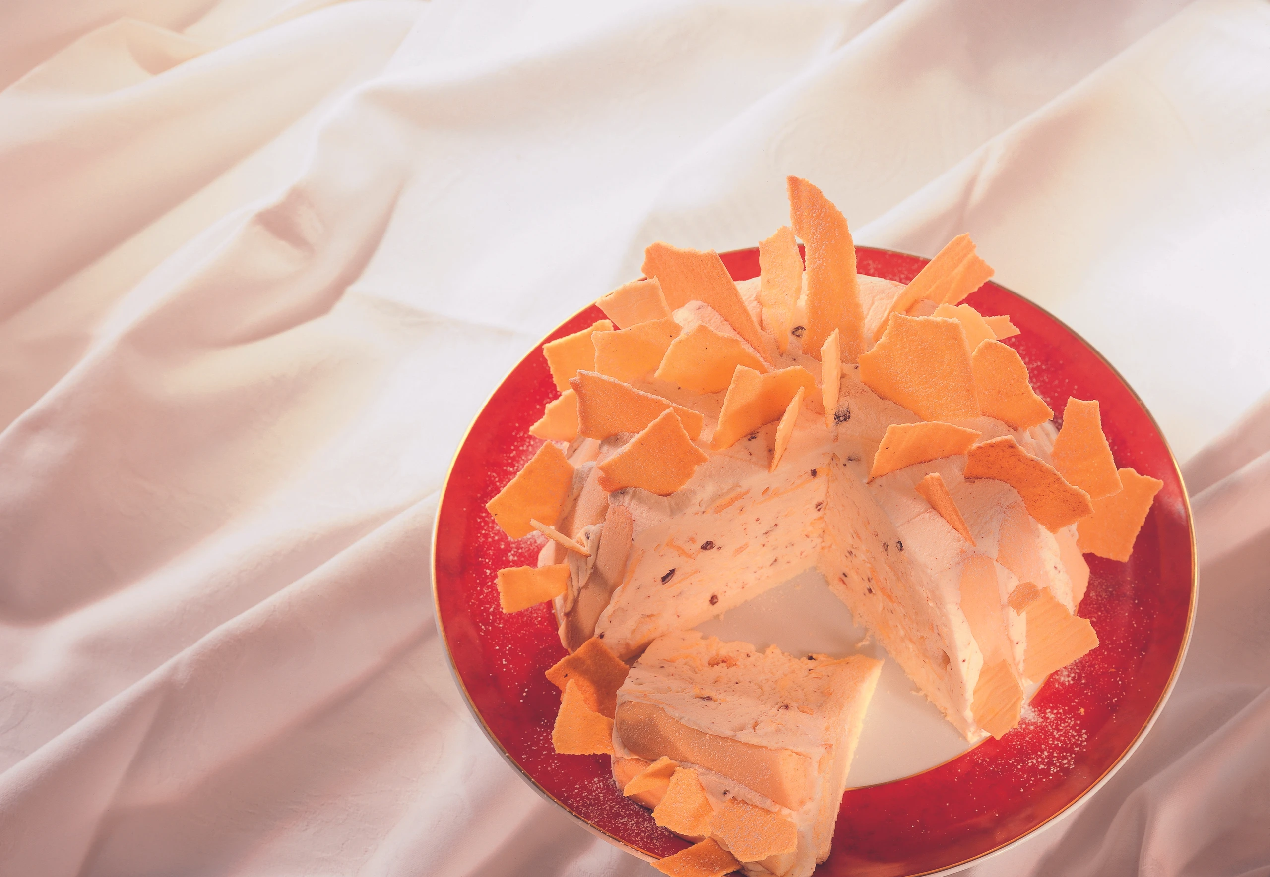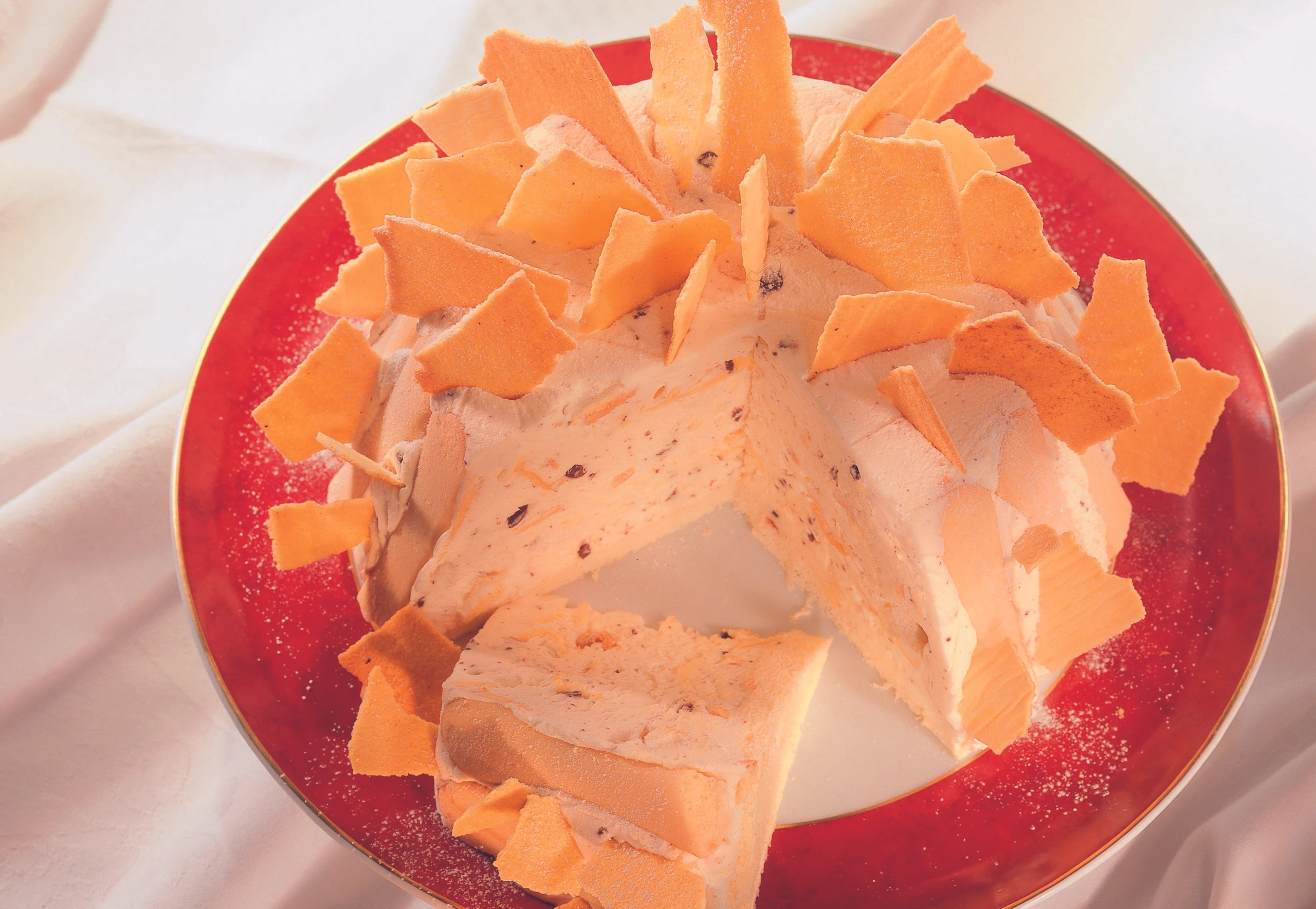 Vor dem Servieren Frischhaltefolie entfernen, Torte auf einen Teller stürzen, Folie abziehen. Torte mit den übrigen Schmankerln garnieren.