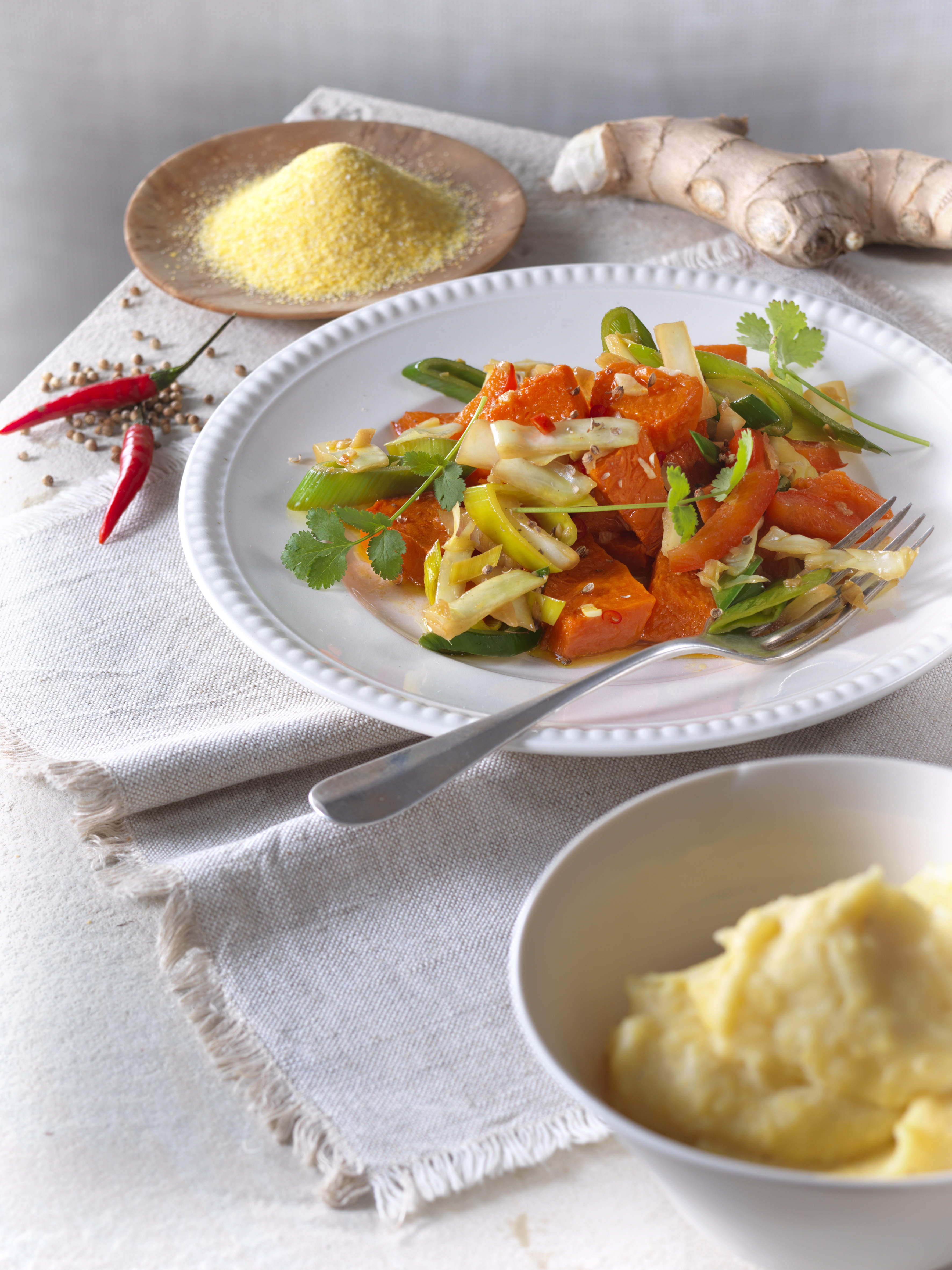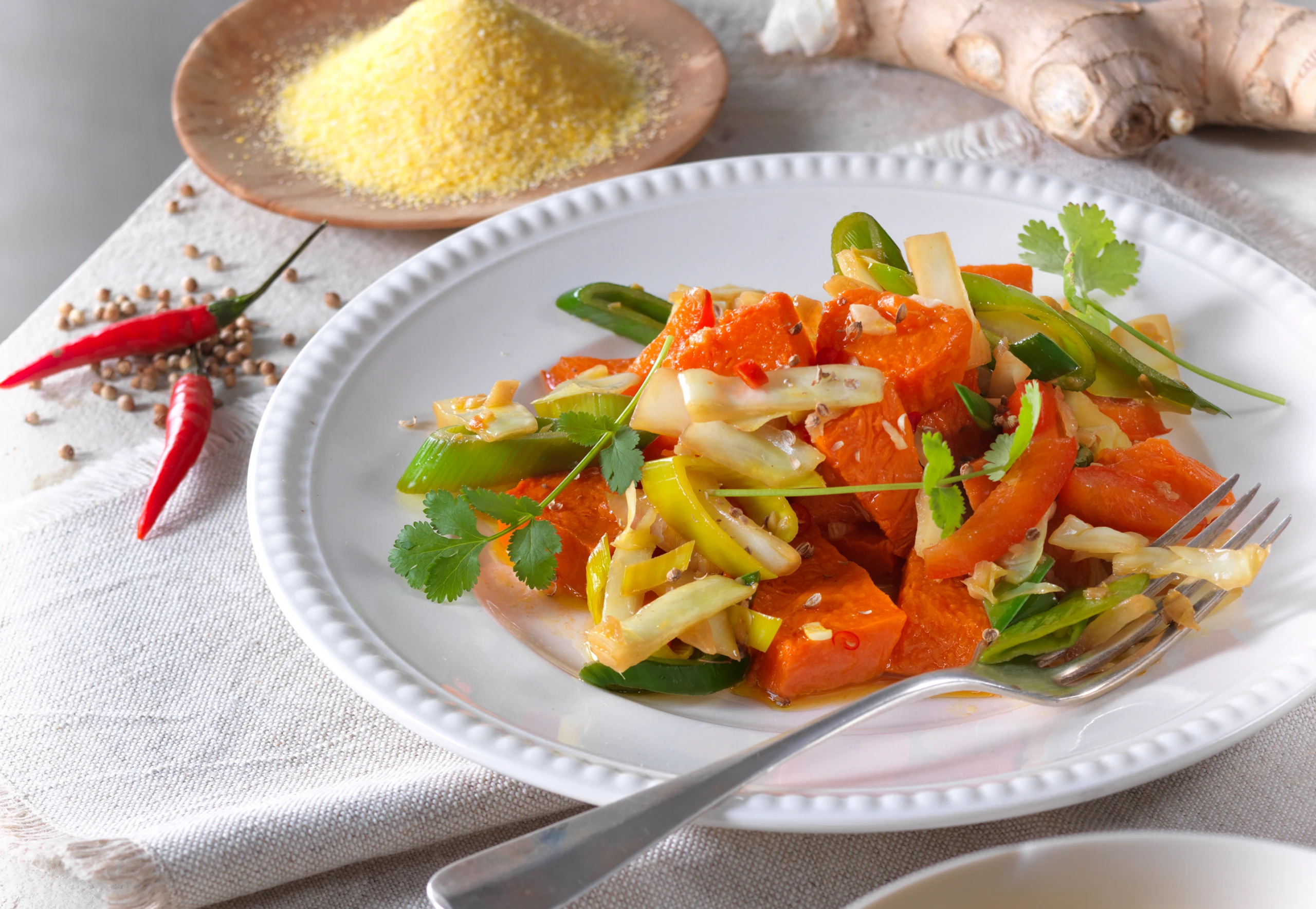 Geschmorten Kürbis mit gebratenem Gemüse anrichten, mit frischem Koriander garnieren, mit Polenta servieren.
