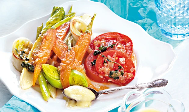 - Lauch und Thymian zugeben, ca. 3 Minuten schmoren. Paradeiser untermischen, salzen und ca. 3 Minuten weiterschmoren. Mit der Flüssigkeit aufgießen und kurz erhitzen. Schmorgemüse mit Salz und Pfeffer abschmecken, mit dem Dip anrichten.