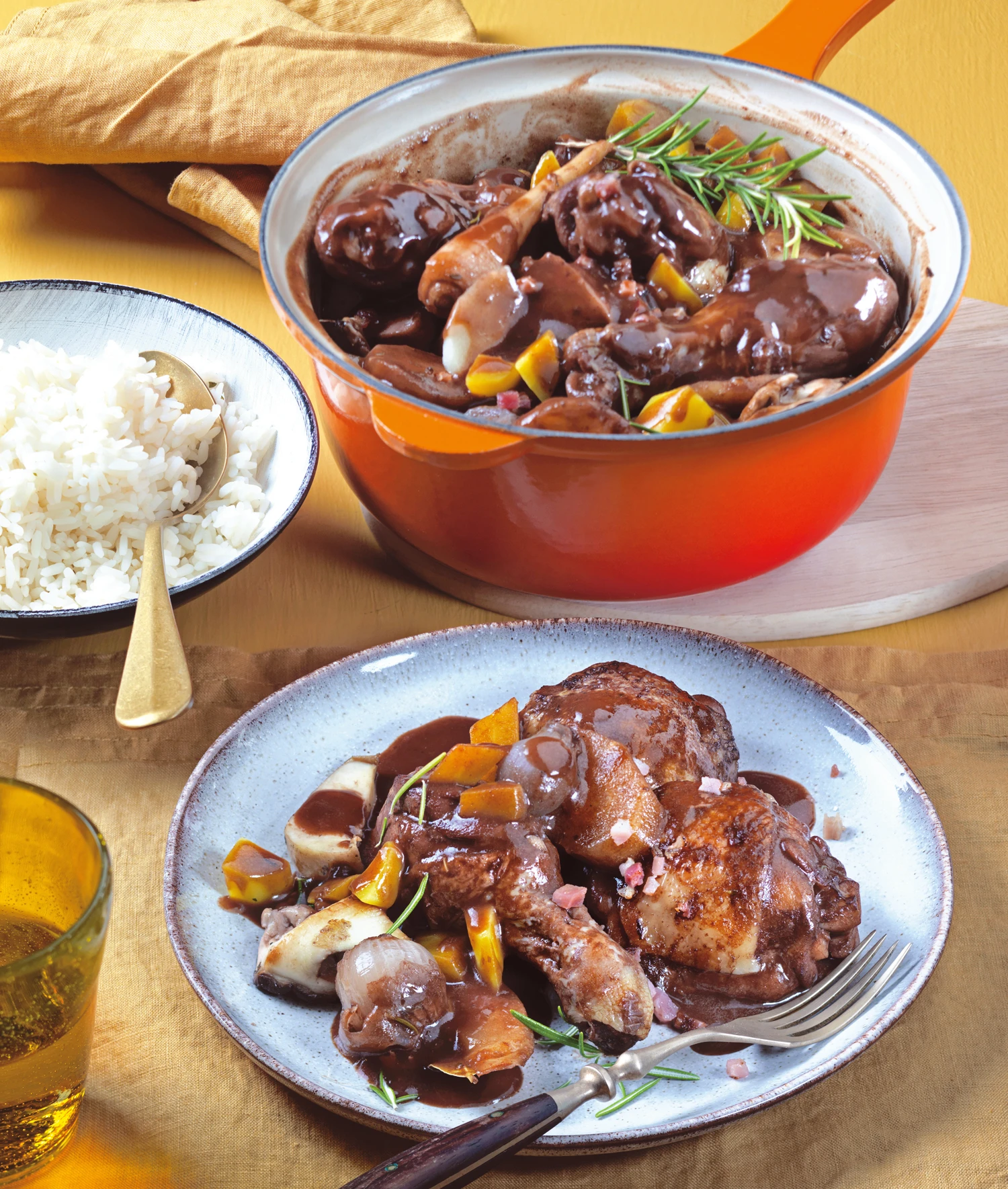 Hühnerstücke aus dem Topf heben und im Rohr warm stellen. Steinpilz-Speckmischung und Rosmarin in die Sauce geben und erwärmen. Hühnerbrustfilets jeweils quer vierteln. Brust- und Keulenfleisch mit der Sauce anrichten und mit dem Reis servieren.