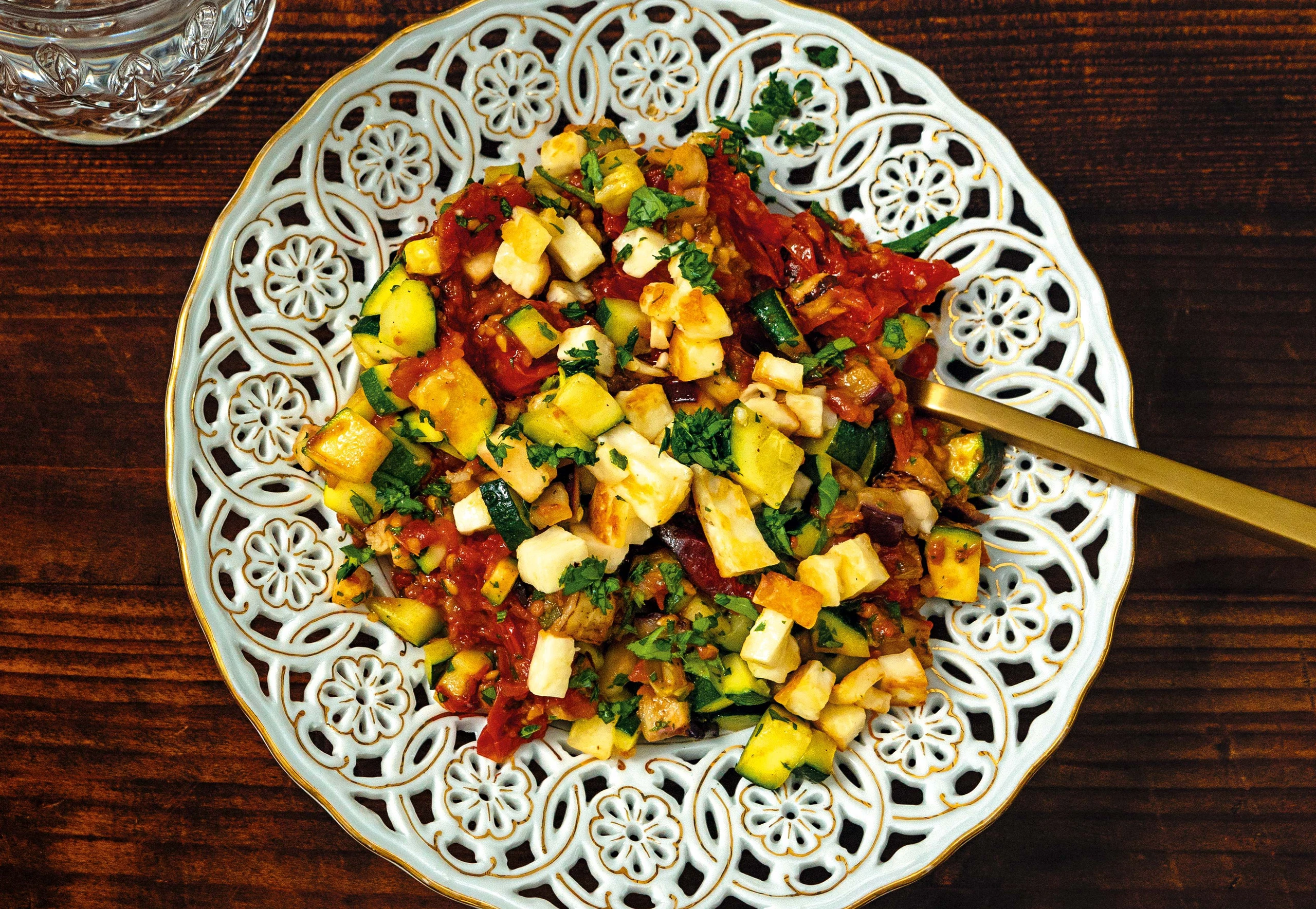 Schmorparadeiser mit Melanzani-Zucchinigemüse und Halloumi