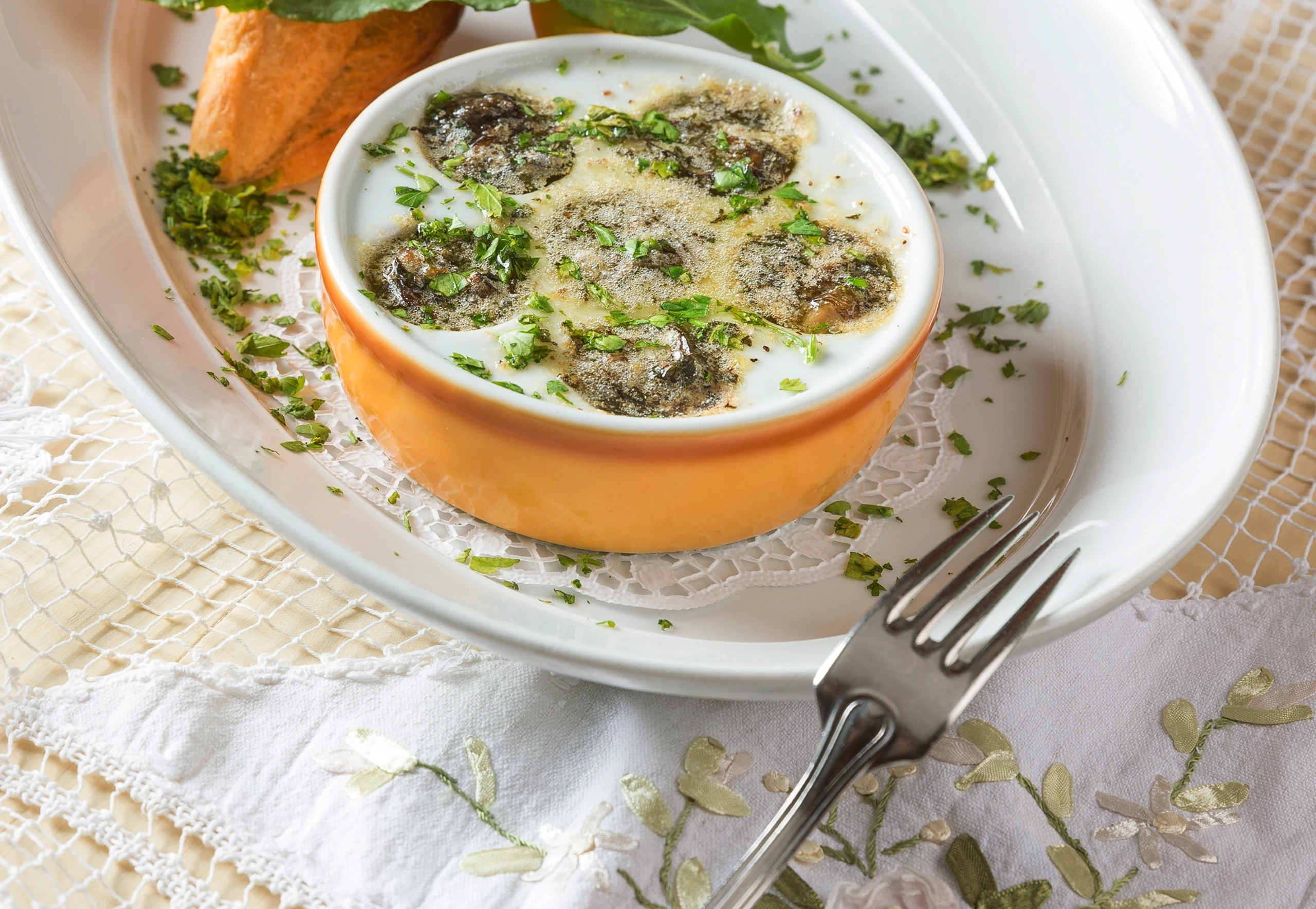 Schnecken im Rohr (mittlere Schiene / Gitterrost) ca. 8 Minuten backen. Baguette erwärmen und in Scheiben schneiden. Schnecken mit dem Baguette servieren. Eventuell mit Sauerampfer garnieren.