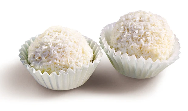 Kuvertüre hacken und über Dampf schmelzen. Mandelkugeln in die Kuvertüre tauchen, abtropfen lassen und in Kokosette wälzen. Kugeln auf ein Stück Backpapier legen und für ca. 30 Minuten kühl stellen. In Pralinenkapseln setzen.