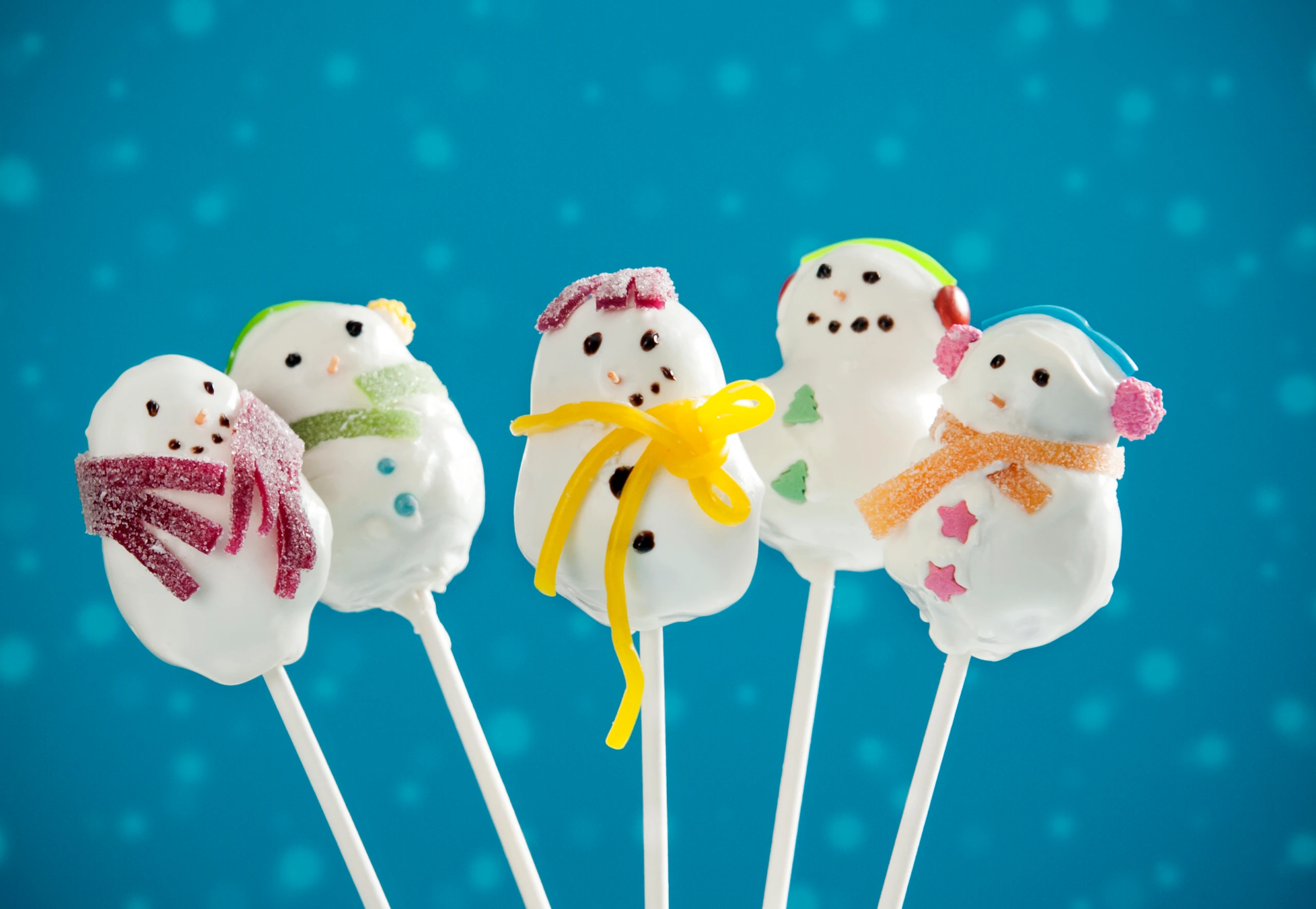 Masse in 10 Portionen teilen, zu Kugeln und dann zur typischen Schneemann-Form modellieren. Schneemänner in Styropor oder eine Halterung stecken und für ca. 15 Minuten kühl stellen.
