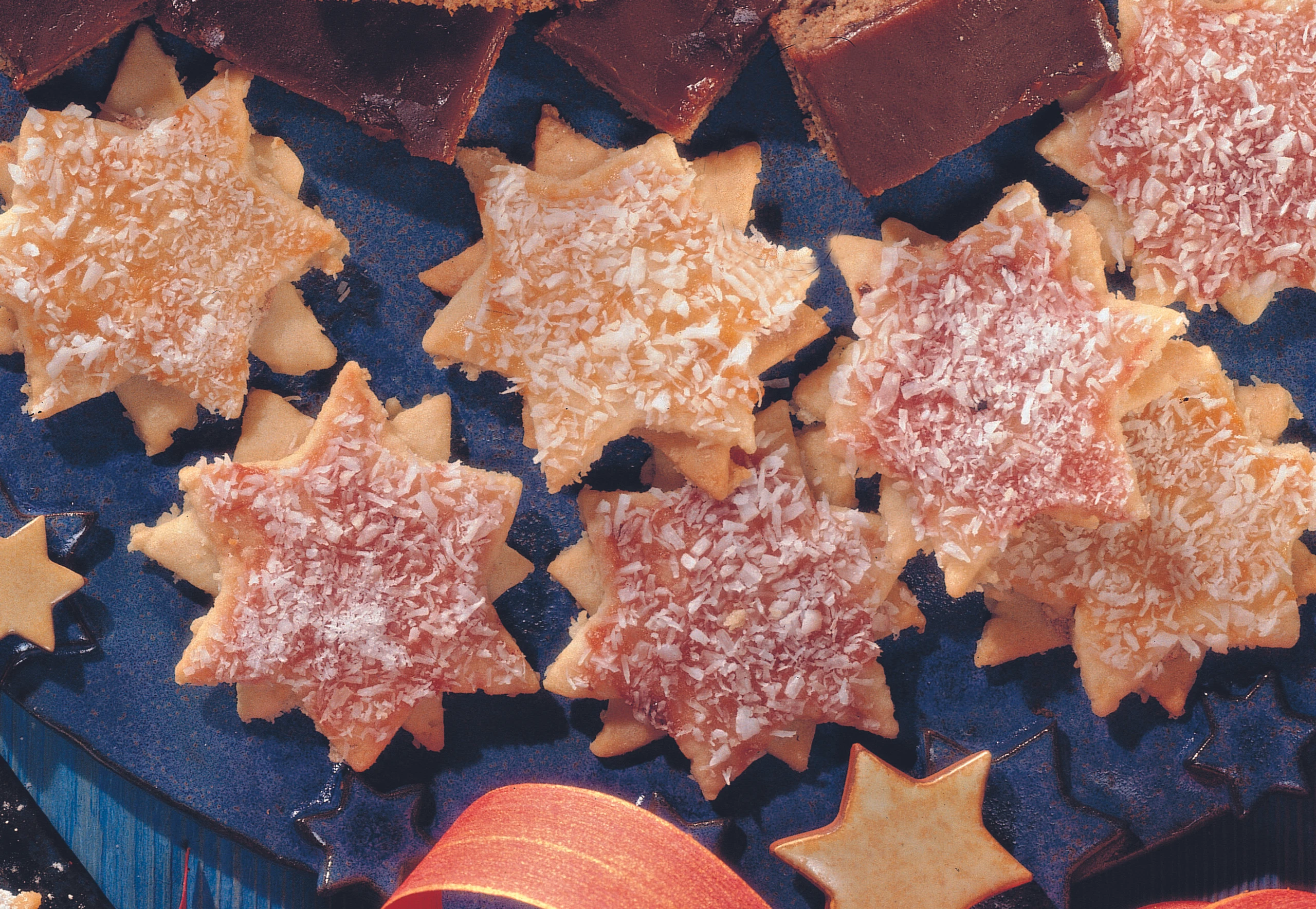 Je zwei Kekse mit Schokoladecreme zusammensetzen. Oberfläche der Kekse mit Marillen- oder Ribiselmarmelade bestreichen und mit Kokosette bestreuen.
