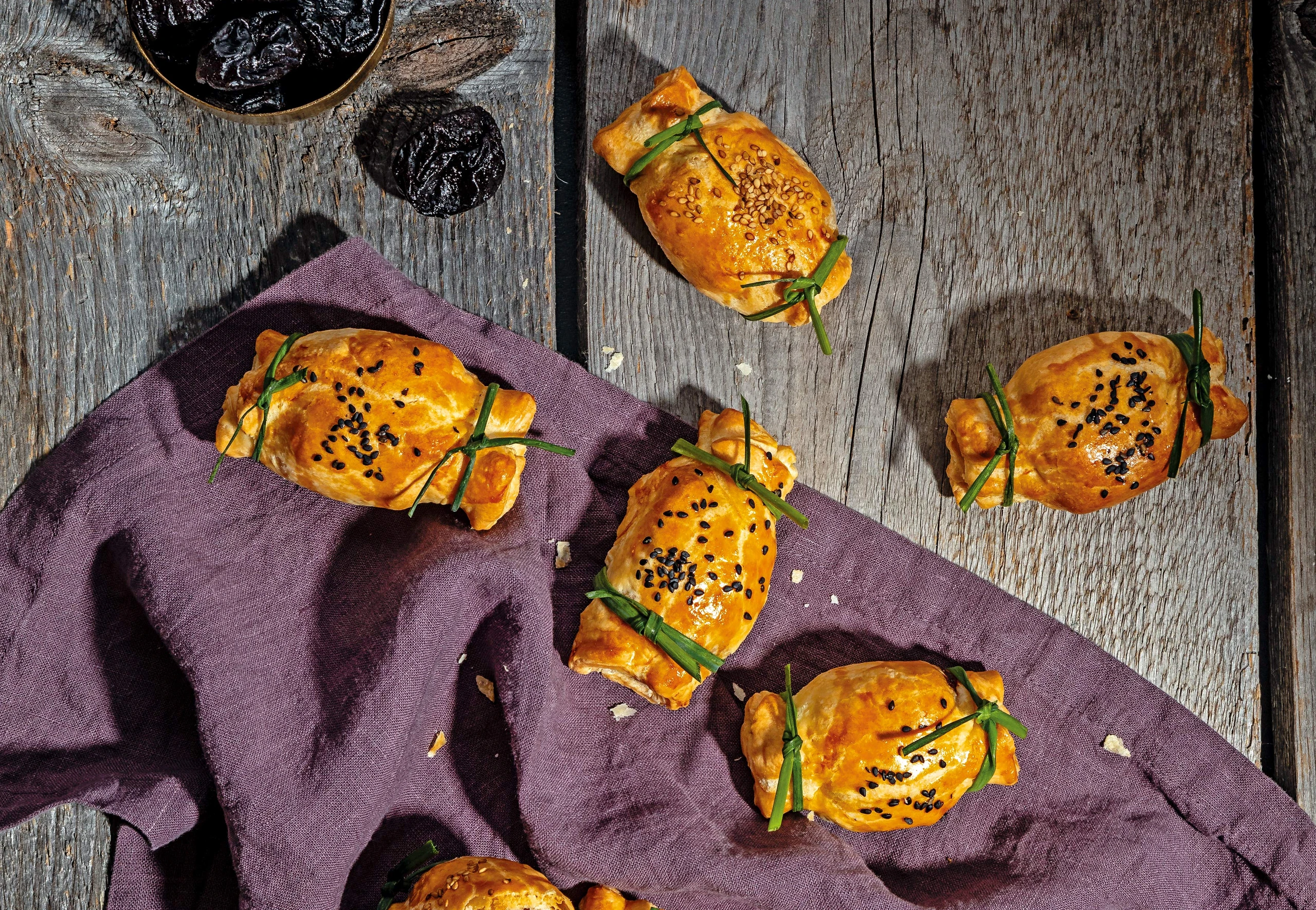 Zwetschken in je 2 Scheiben Speck einrollen. Blätterteig in 12 Rechtecke schneiden, Speckzwetschken darin einrollen. Enden zusammendrücken.