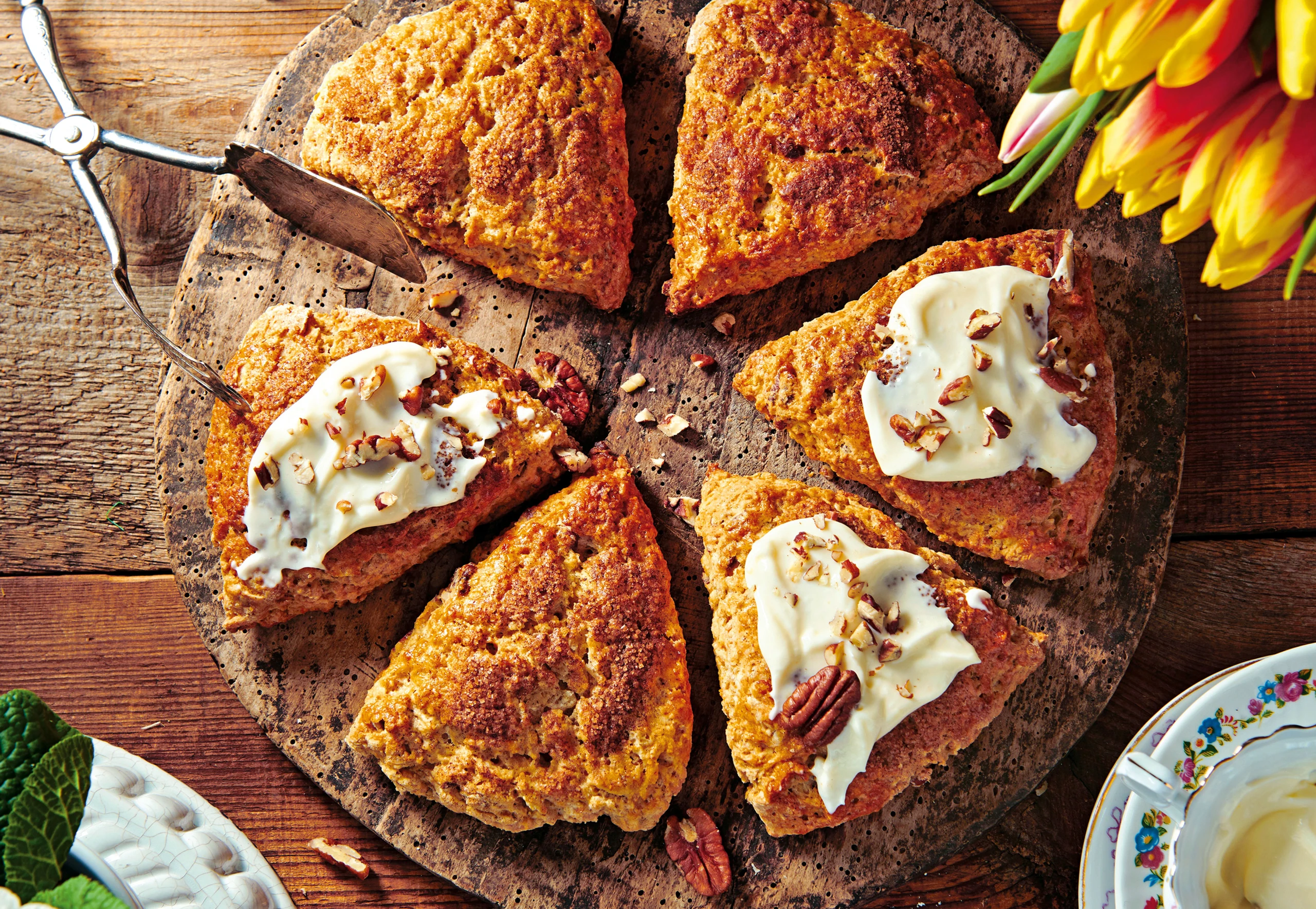 Für den Teig Mehl, Backpulver, Zucker und Zimt verrühren. Butter zugeben und mit den Fingerspitzen zügig verreiben, es soll eine bröselige Masse entstehen und Butterstücke erhalten bleiben. Ei, Buttermilch, Karotten und Nüsse zugeben. Rasch und kurz verkneten. Es soll kein glatter Teig entstehen, die Zutaten sollen nur zusammenhalten. Teig zu einer Scheibe formen, zusammendrücken und in 6 Stücke schneiden.