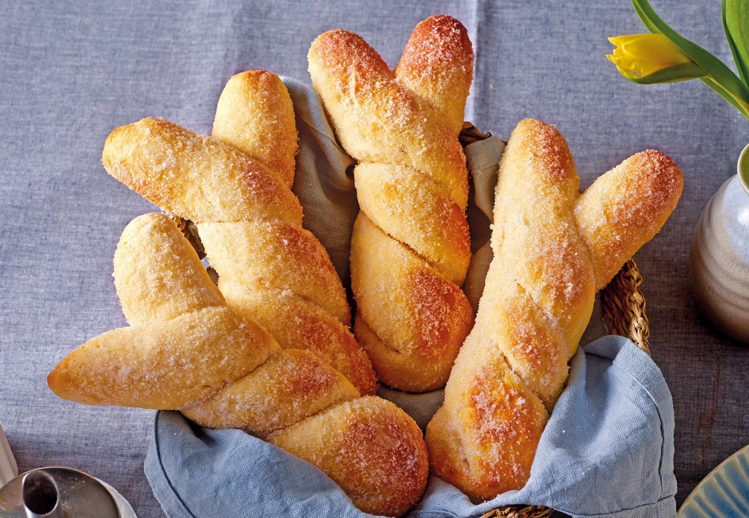 Alle Zutaten zu einem geschmeidigen Teig kneten. Teig auf einer leicht bemehlten Arbeitsfläche in 8 Stücke teilen. Teigstücke mit den Händen zu Strängen formen und zu Haserln eindrehen.