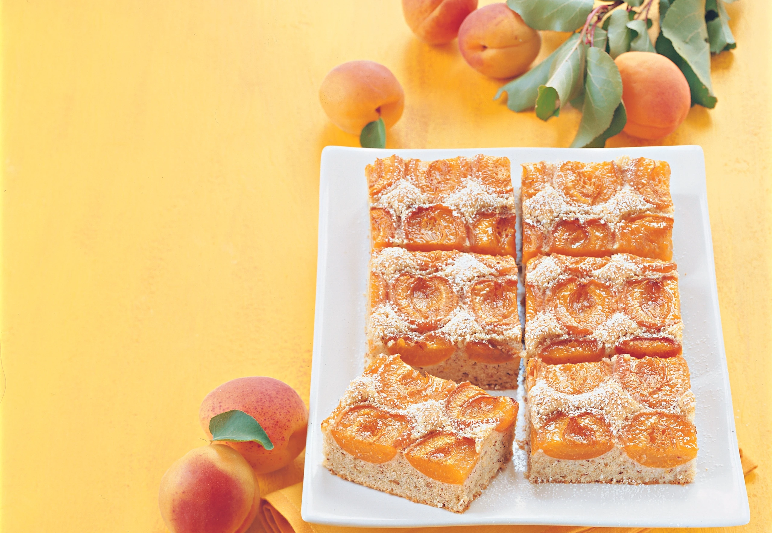 Masse gleichmäßig auf dem Blech verstreichen und mit den Marillen (Schnittfläche oben) belegen. Kuchen im Rohr (mittlere Schiene) ca. 45 Minuten backen.