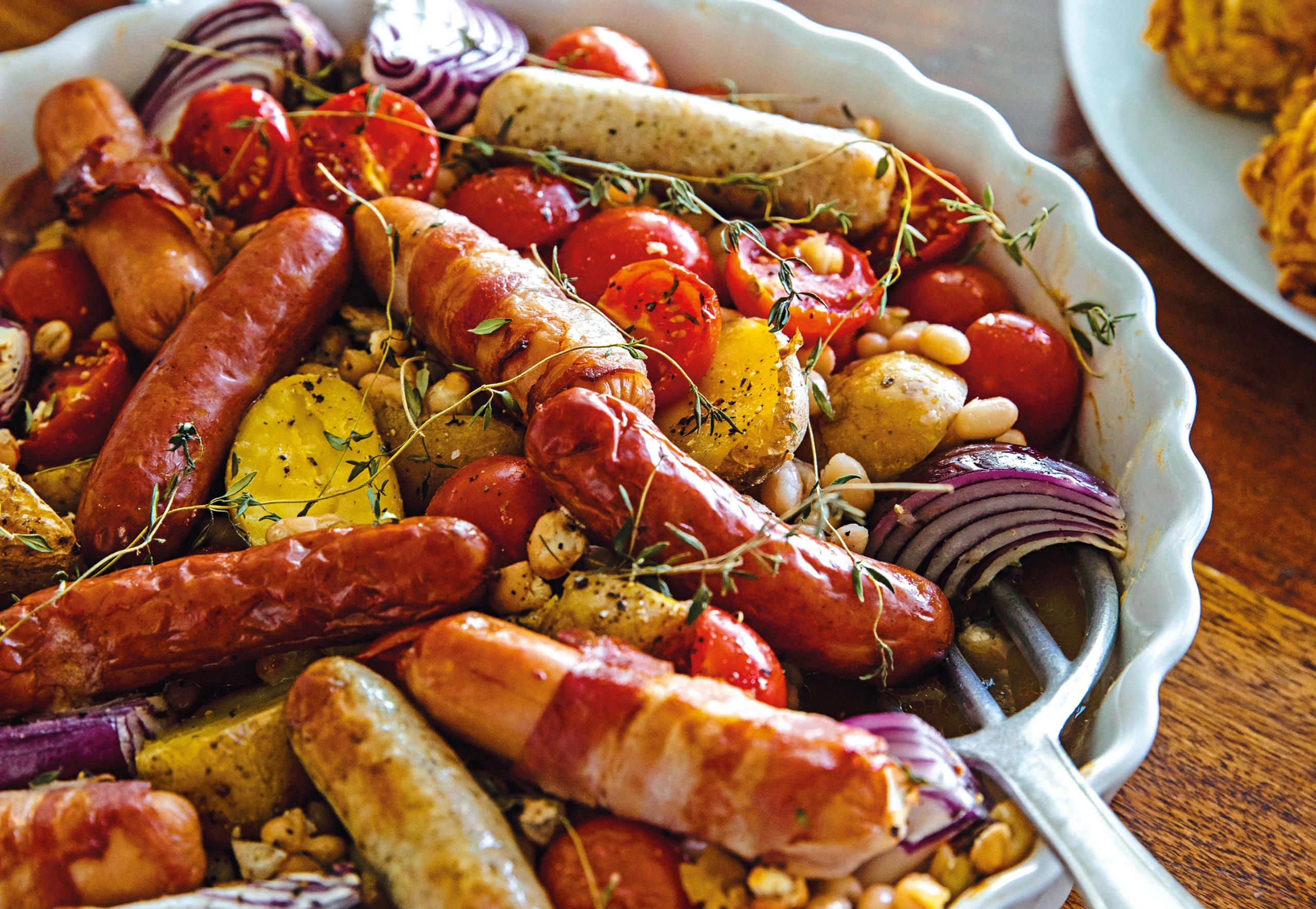 Bohnen mitsamt der Flüssigkeit zugießen. Olivenöl darüber träufeln und mit Salz und Pfeffer kräftig würzen. Alles gut durchmischen. Würstel und Thymianzweige darauf verteilen. Im Rohr (mittlere Schiene / Gitterrost) ca. 30 Minuten garen, bis die Würstel schön knusprig sind.