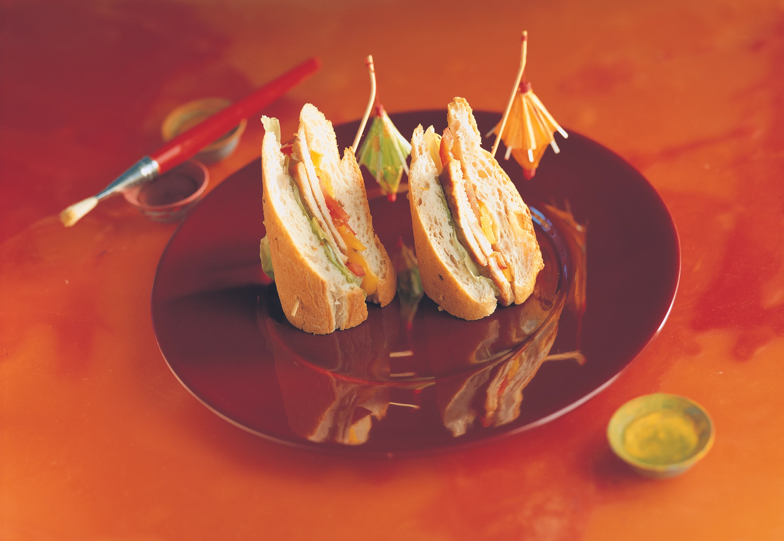 Baguette in Stücke schneiden, die Stücke diagonal halbieren und mit kleinen Holzspießen fixieren. Brote lauwarm servieren.