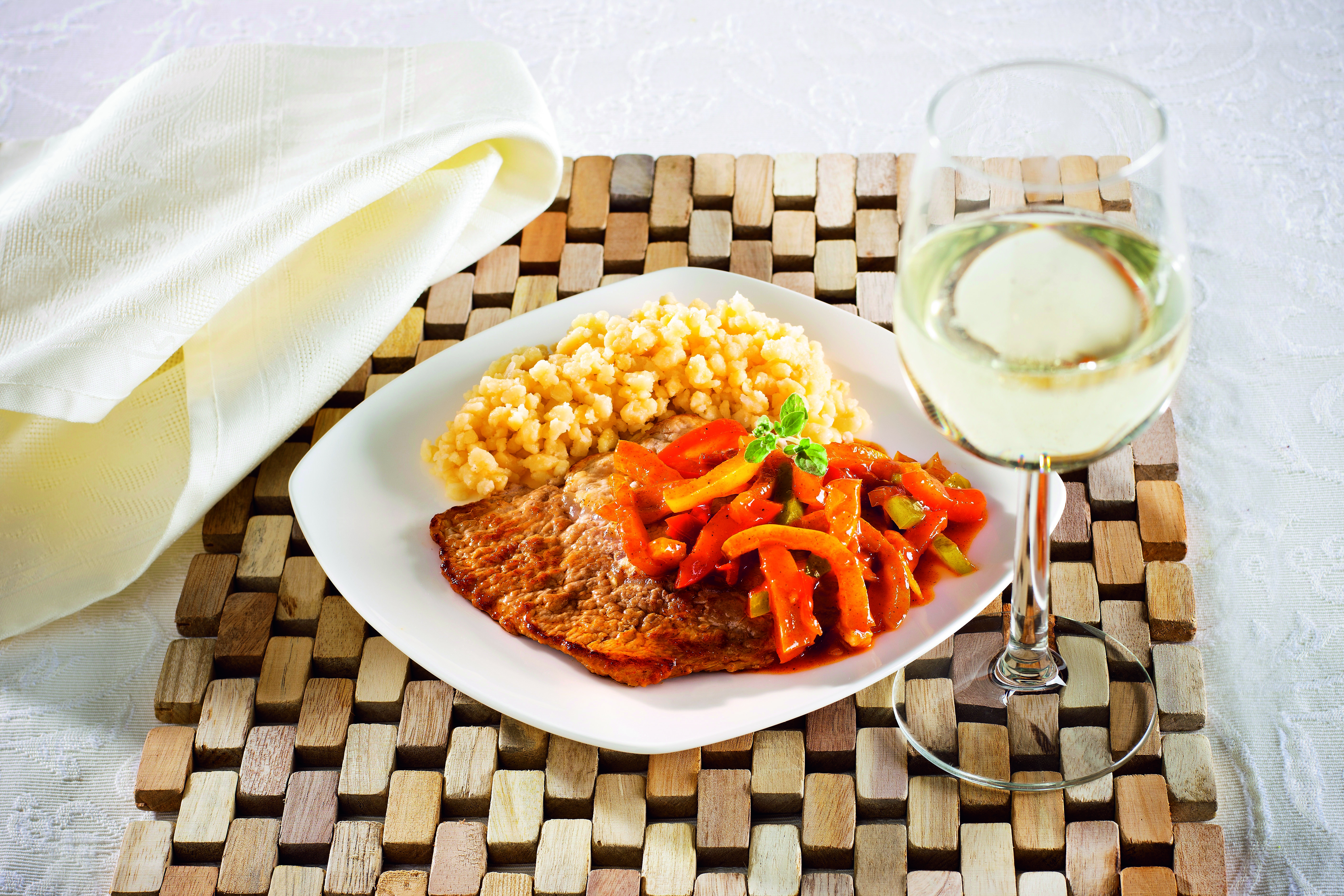 Schnitzel herausnehmen und beiseite stellen. Stärke mit 1 EL Wasser glatt rühren, in das Letscho gießen und aufkochen. Fleisch einlegen und darin erwärmen. Schnitzel mit dem Letscho anrichten. Dazu passt Tarhonya.