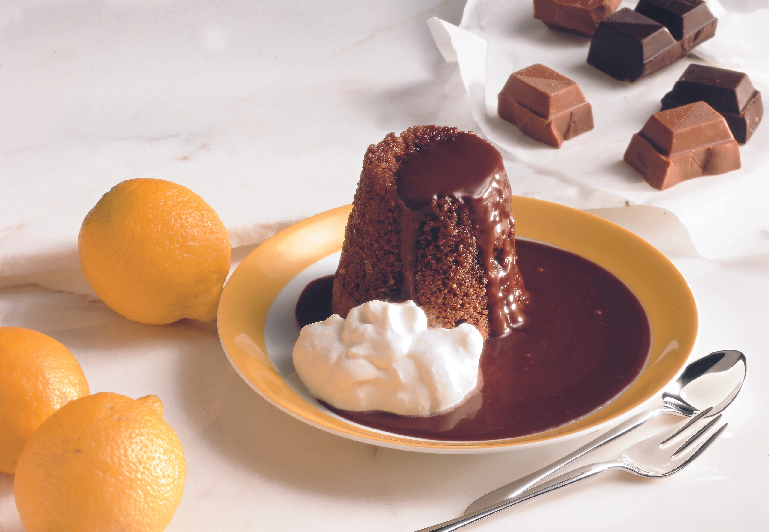 Förmchen aus dem Rohr nehmen, Aufläufe auf Teller stürzen und mit warmer Schokoladesauce und halbfest geschlagenem Obers servieren.