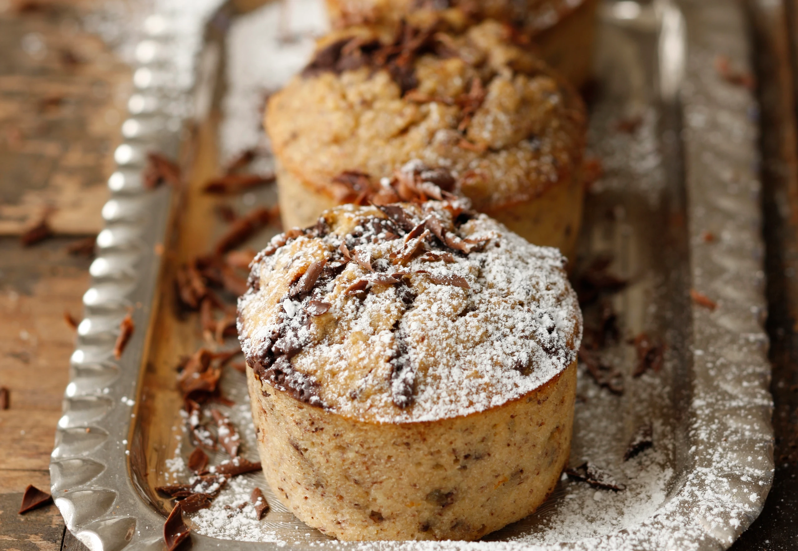 Mehl, Nüsse, Backpulver und Salz vermischen und rasch unter die Bananenmischung heben. Schokolade grob hacken und untermischen. Teig in den Förmchen verteilen und im Rohr (mittlere Schiene / Gitterrost) goldgelb backen (ca. 35 Minuten). Cakes eventuell mit Schokoflocken garnieren.