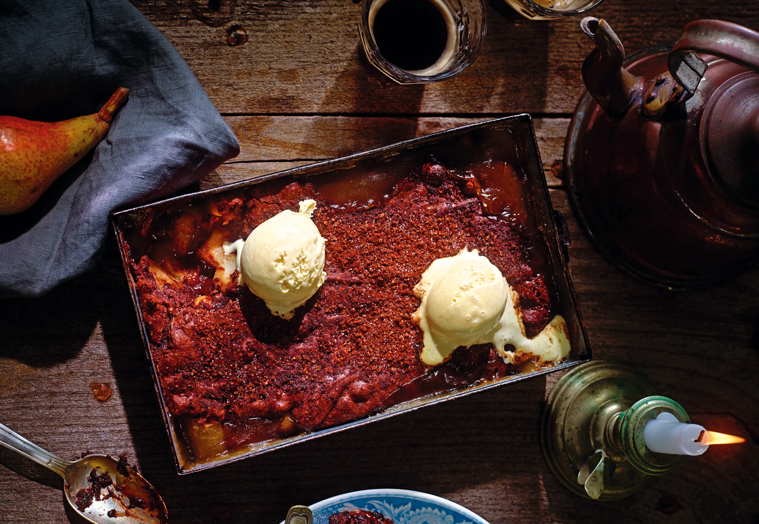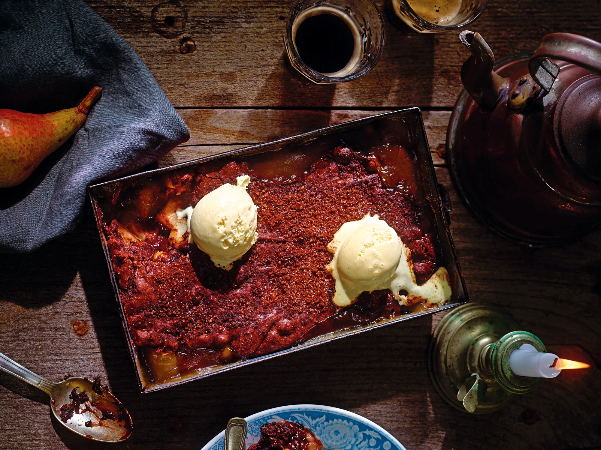 Karamellbirnen in der Form verteilen. Schokomasse darauf verstreichen. Auflauf im Rohr (mittlere Schiene) ca. 40 Minuten backen. Herausnehmen und mit dem Vanilleeis servieren.