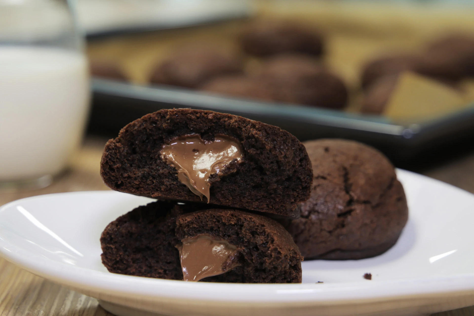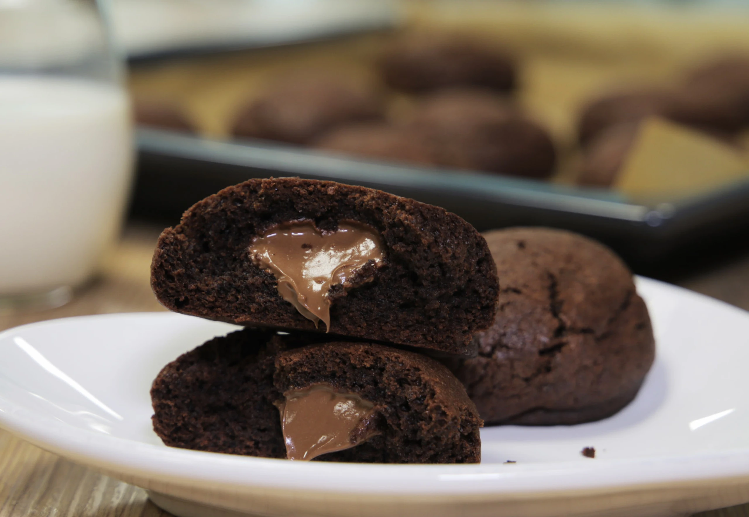 Teig in 12 Stücke teilen und zu Kugeln formen. Jede Teigkugel flachdrücken, ein Nougatstück in die Mitte setzen und den Teig über das Nougat schlagen und rund formen.