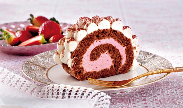 Für die Garnitur Obers schlagen und in einen Dressiersack (glatte Tülle) füllen. Roulade mit Obers garnieren. Tupfer mit Kakao bestreuen.