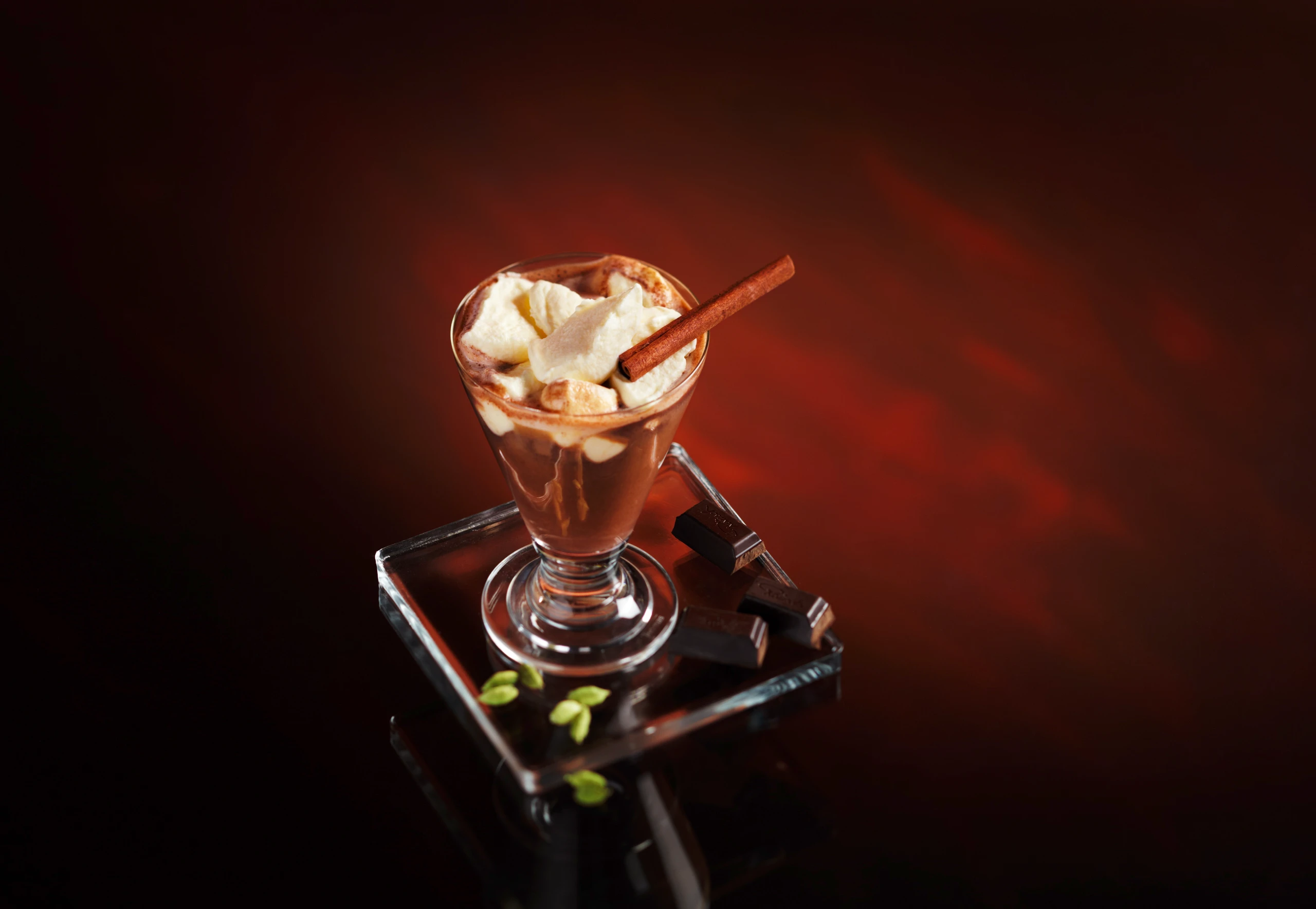 - Milch mit den Gewürzen erhitzen und ca. 10 Minuten ziehen lassen. Milch abseihen, erhitzen, Schokolade darin auflösen. Obers schlagen.
