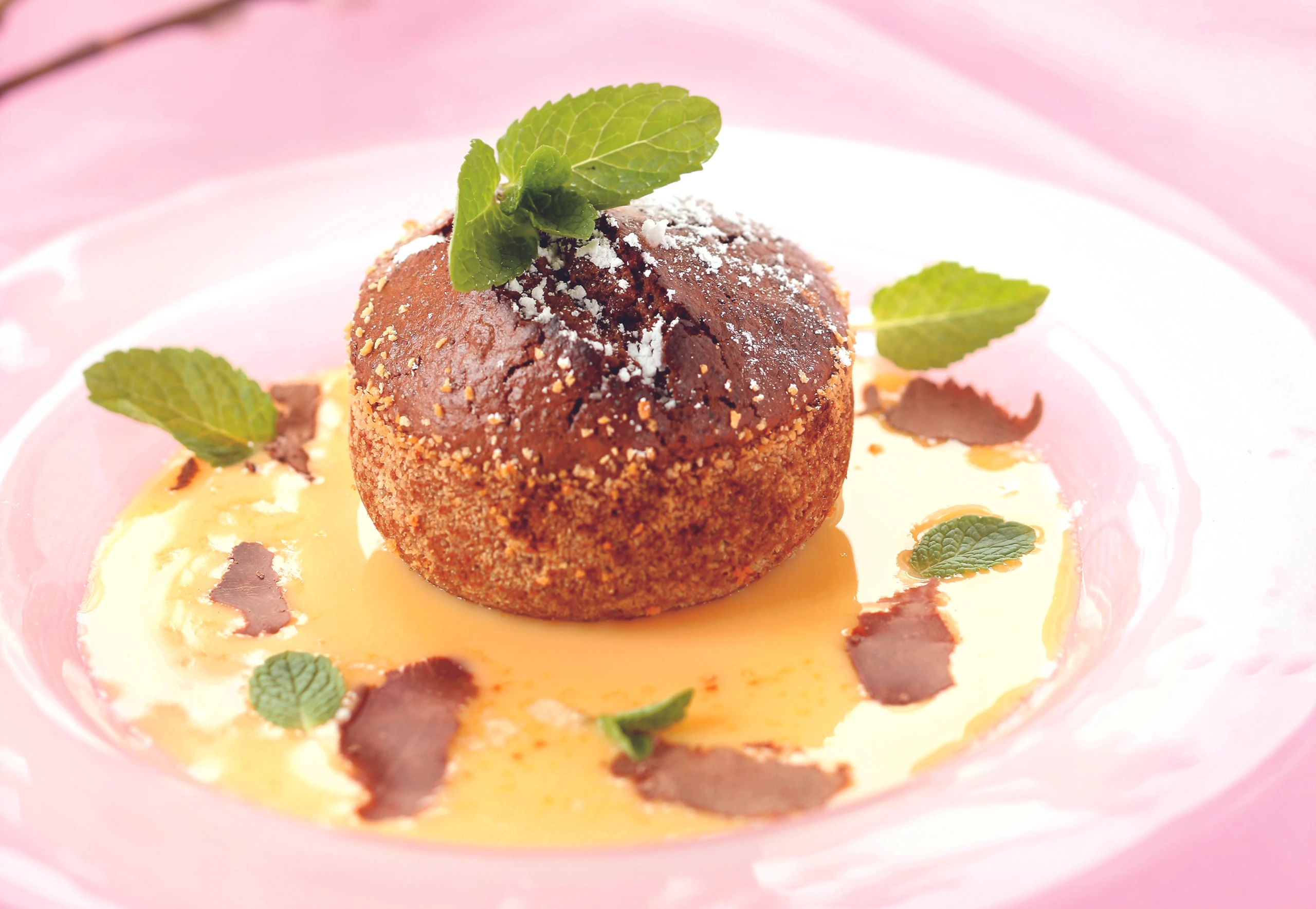 Likör und Crème fraîche verrühren und erwärmen. Aufläufe auf Teller stürzen, mit Sauce und Minze garniert servieren.