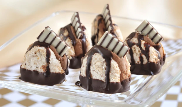 - Schokomousse in einen Dressiersack mit glatter Tülle (Ø 10 mm) füllen und auf die Hälfte der Baisers dressieren. Mit einem zweiten Baiser zusammensetzen und kühl stellen.