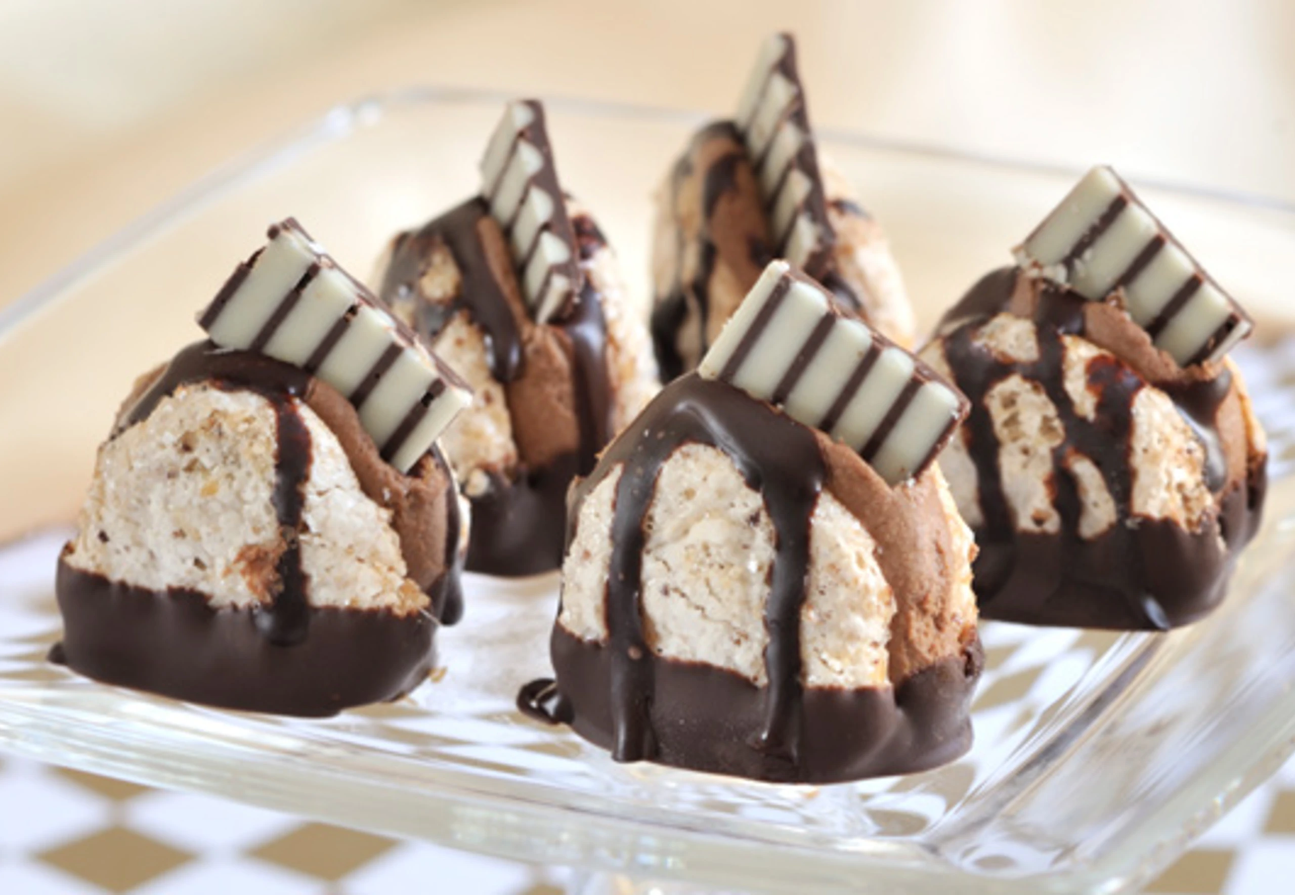 Schokomousse in einen Dressiersack mit glatter Tülle (Ø 10 mm) füllen und auf die Hälfte der Baisers dressieren. Mit einem zweiten Baiser zusammensetzen und kühl stellen.