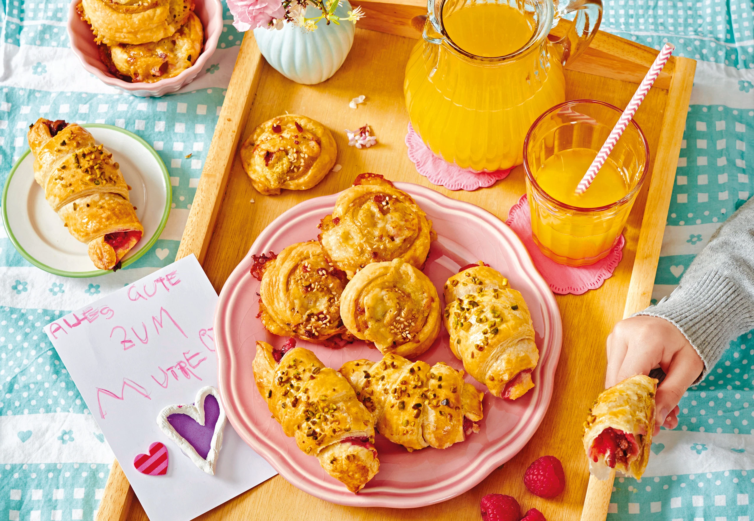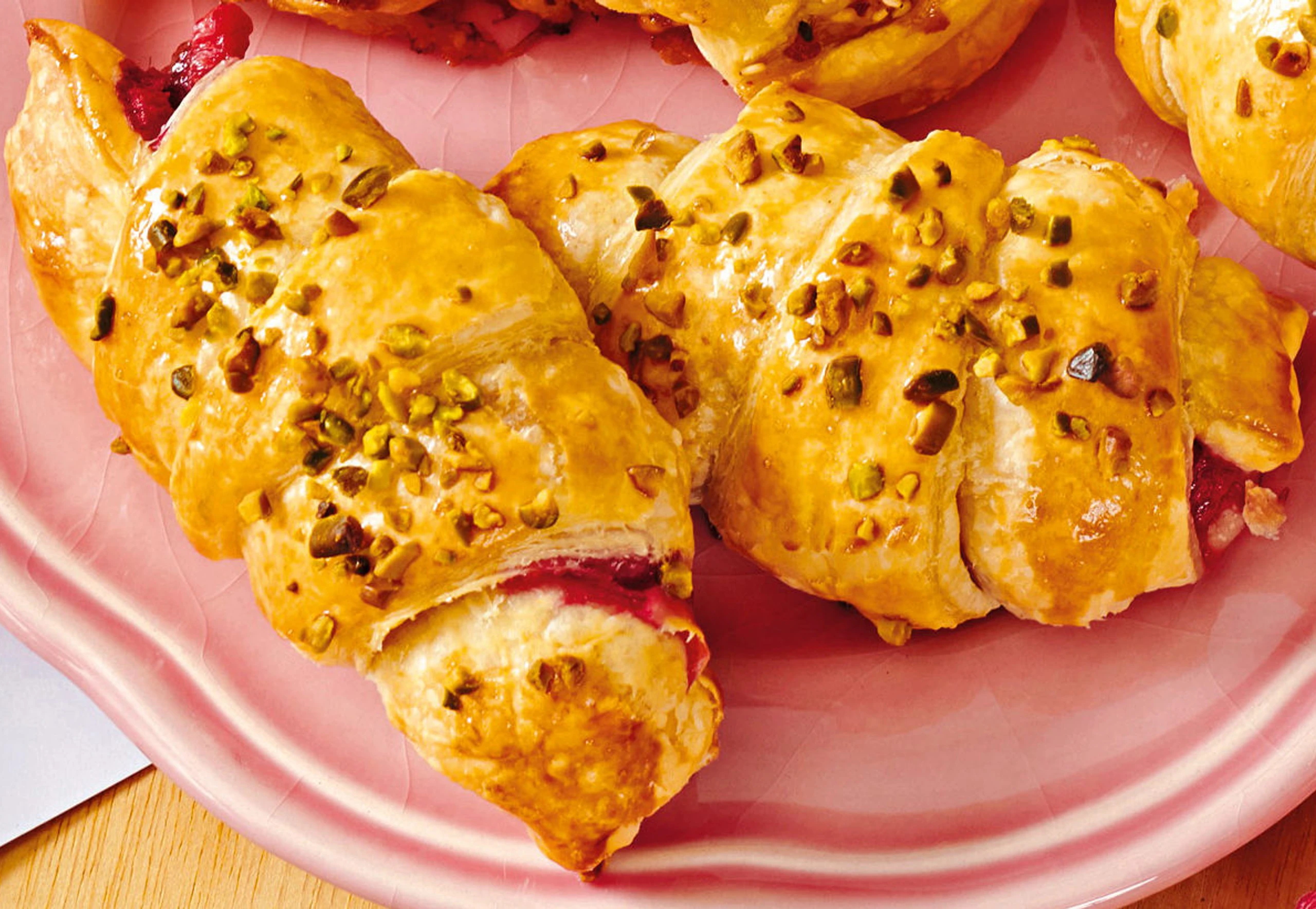 Hörnchen auf das Blech legen. Mit Ei bestreichen und mit Pistazien bestreuen. Im Rohr (mittlere Schiene) ca. 25 Minuten goldbraun backen. Herausnehmen und überkühlen lassen.