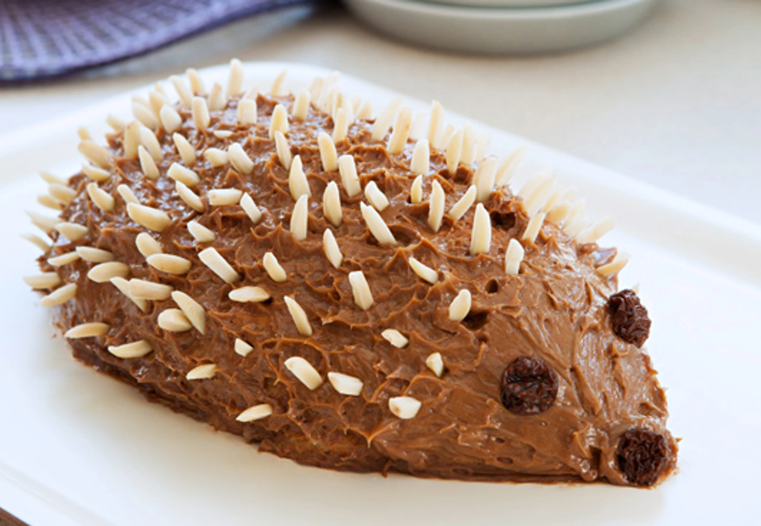 Igel rundum mit übriger Creme einstreichen, mit Mandelstiften und Rosinen garnieren. Schoko-Igel für ca. 10 Stunden kühl stellen.
